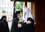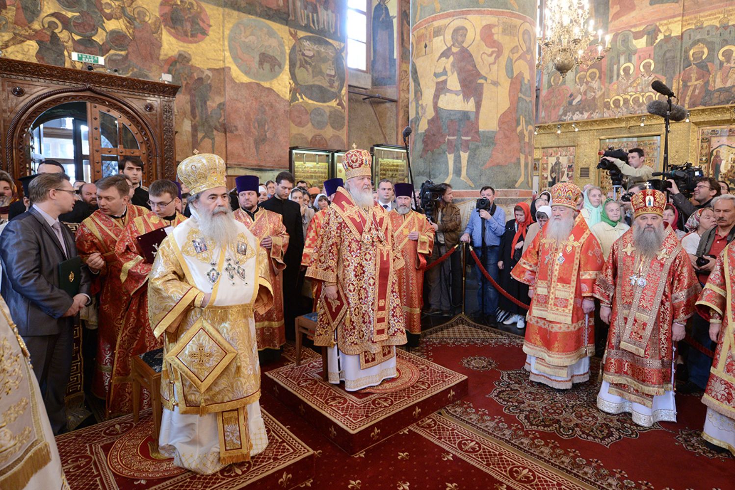 Святейший Патриарх Московский и всея Руси Кирилл и Блаженнейший Патриарх Иерусалимский Феофил III совершили в Успенском соборе Божественную литургию. По окончании Литургии Святейший Патриарх Кирилл приветствовал преподнес Блаженнейшему Патриарху Феофилу набор из двух панагий и креста и Патриарший жезл.