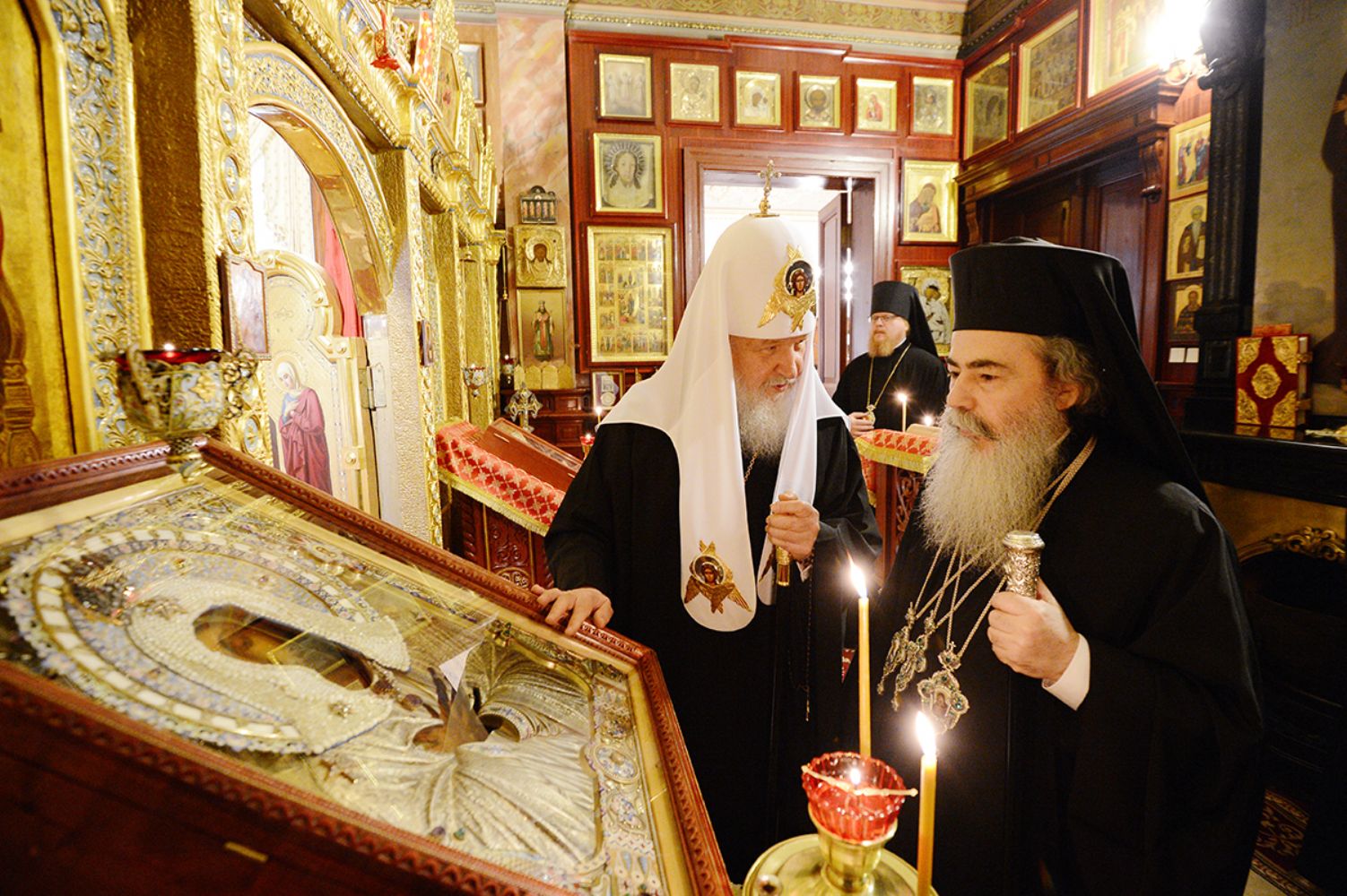 Также в Тронном зале Святейший Патриарх Кирилл вручил Блаженнейшему Патриарху Иерусалимскому и всей Палестины Феофилу орден святого равноапостольного князя Владимира I степени. Высоких наград Русской Православной Церкви также были удостоены члены делегации, сопровождающей Патриарха Феофила.
