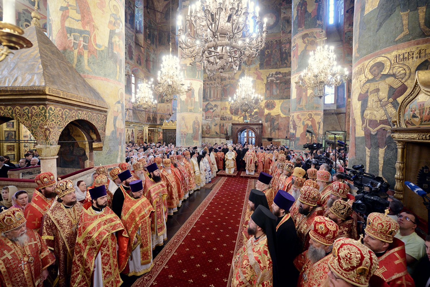 Москва. 24 мая 2013 года, в день памяти святых равноапостольных Мефодия и Кирилла, учителей Словенских (тезоименитство Святейшего Патриарха Кирилла), торжества по случаю Дней славянской письменности и культуры начались в Патриаршем Успенском соборе Московского Кремля.