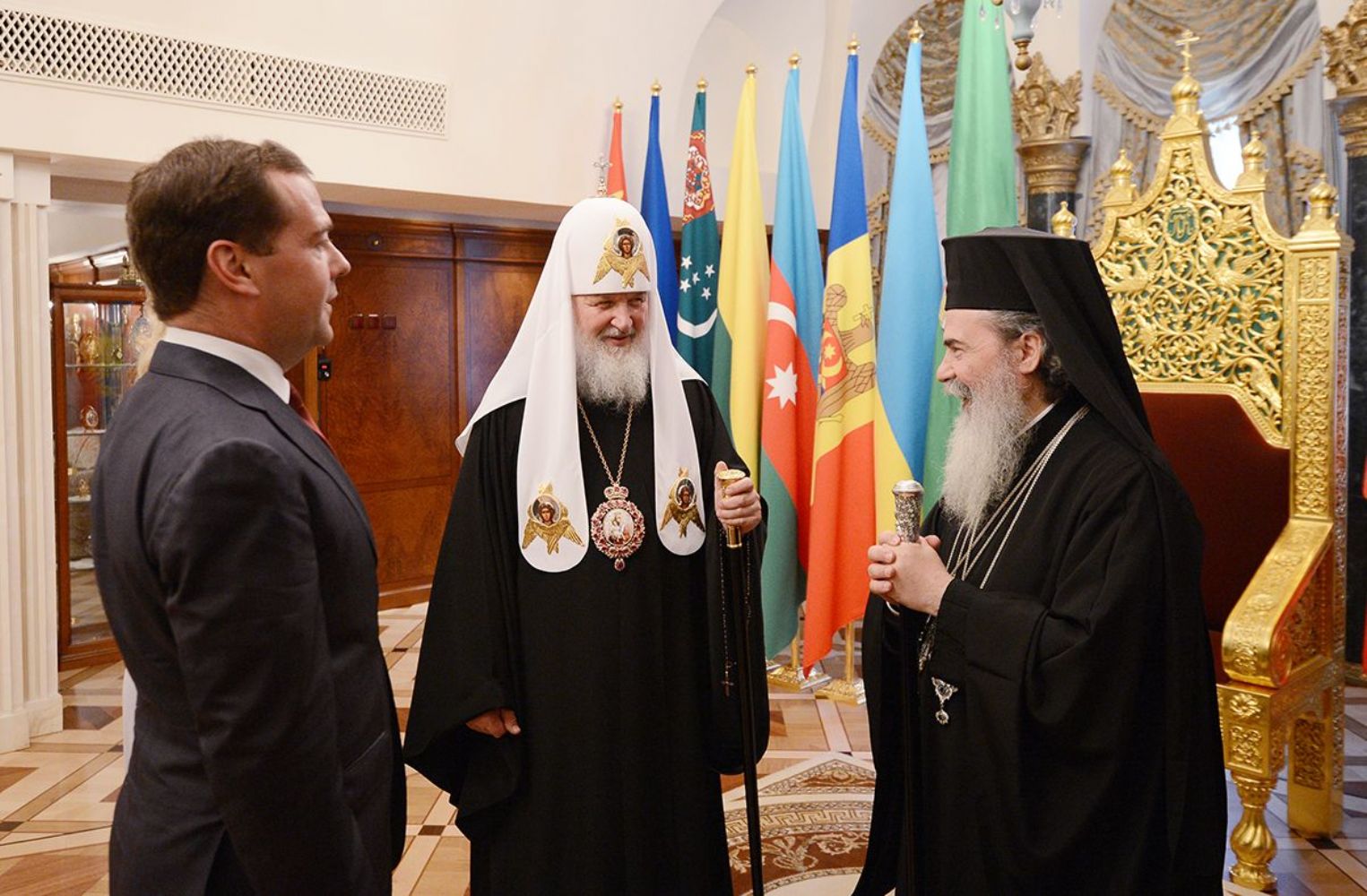 В Тронном зале кафедрального соборного Храма Христа Спасителя Святейший Патриарх Кирилл принял председателя Правительства Российской Федерации Д.А. Медведева с супругой. Председатель Правительства поздравил Предстоятеля Русской Церкви с днем тезоименитства и праздником славянской письменности и культуры, а также приветствовал Блаженнейшего Патриарха Иерусалимского и всея Палестины Феофила, прибывшего с визитом в пределы Русской Православной Церкви и принимающего участие в торжествах Дня славянской письменности. Затем состоялась беседа Предстоятелей Иерусалимской и Русской Православных Церквей с Д.А. Медведевым.