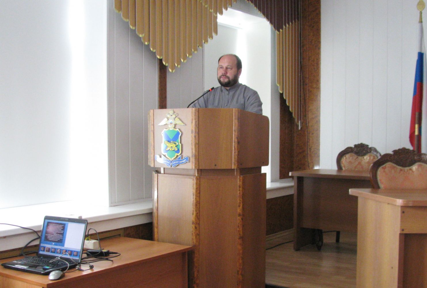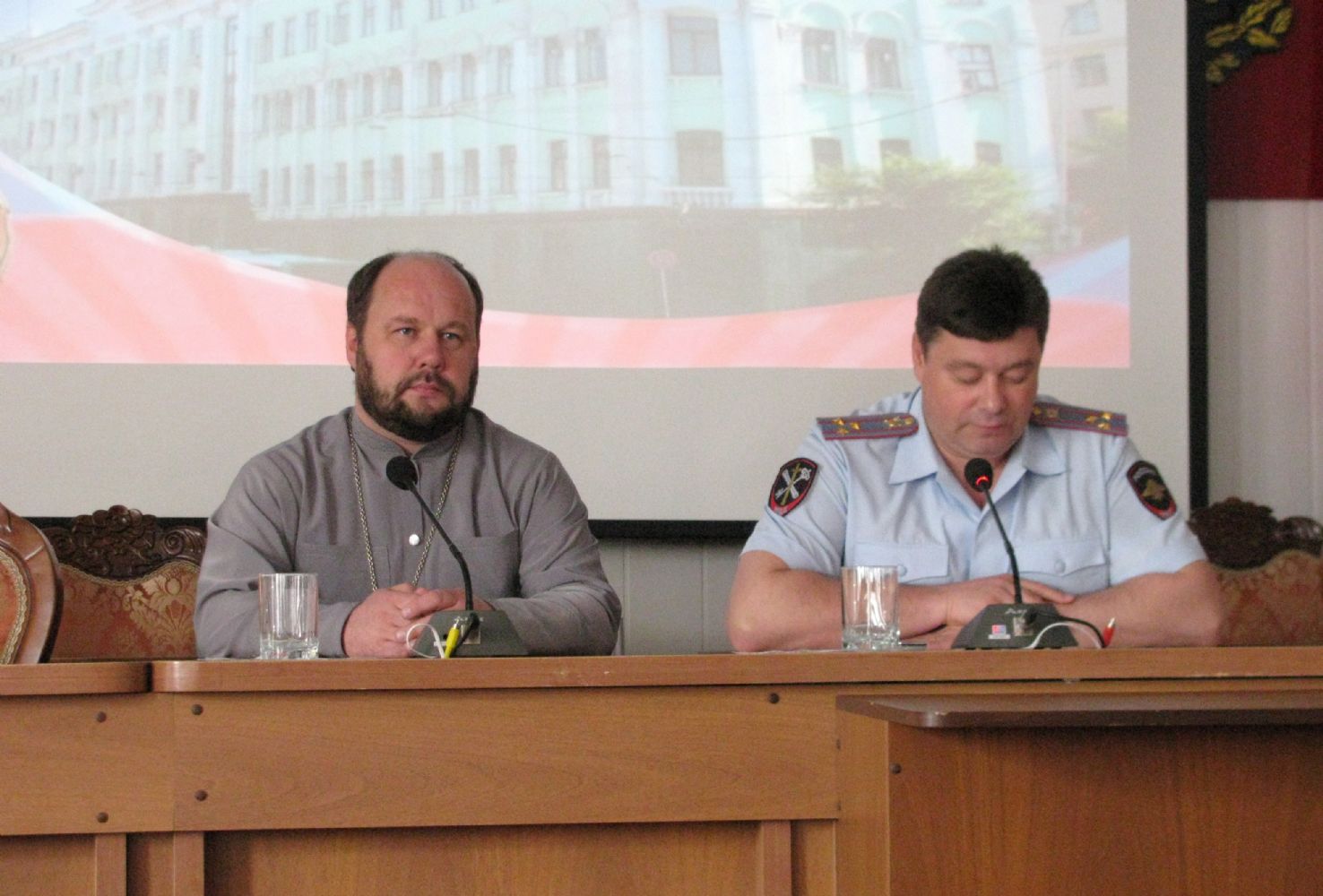24 мая, в день памяти святых братьев Кирилла и Мефодия, прошла беседа духовенства с сотрудниками УВД по Приморскому краю на тему «Совершенствование деятельности сотрудников органов внутренних дел: духовно-нравственный аспект». На встрече присутствовал начальник управления по работе с личным составом полковник внутренней службы Игорь Александрович Кокоза и личный состав управления, всего порядка 70 человек.