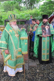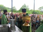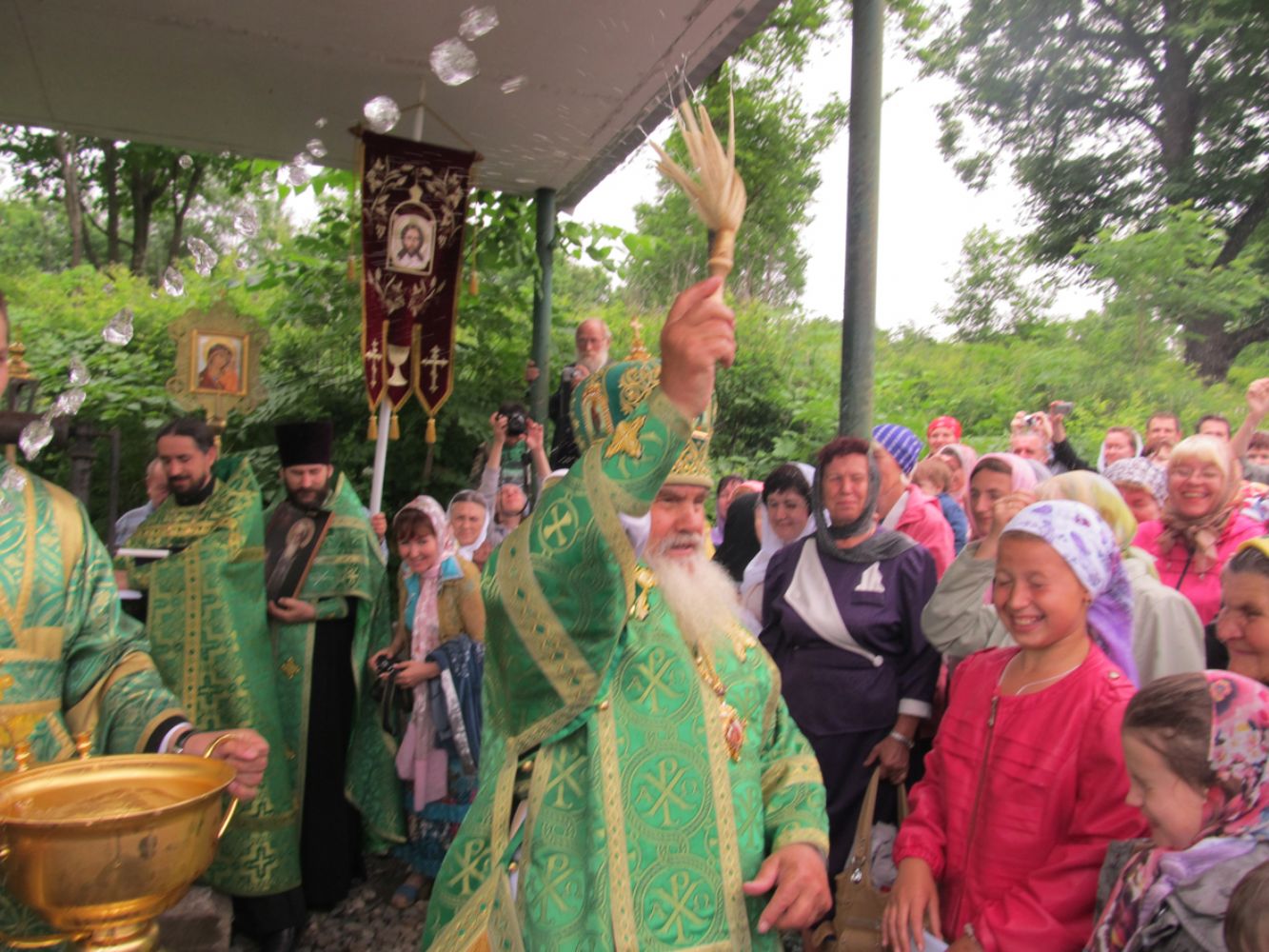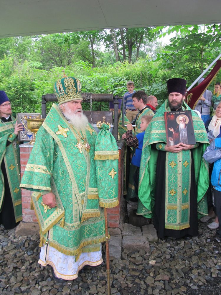 Каждый желающий из прибывших на службу смог утолить духовную жажду и причаститься святых Христовых Тайн. А после литургии все участники торжеств прошли крестным ходом к водоносному источнику. Там состоялся молебен прп. Тихону Калужскому, во время которого владыка Вениамин освятил воды в обустроенном источнике и обильно окропил крестоходцев освященной колодезной водой. По окончании молебна паломники смогли вдоволь испить чистейшей воды и набрать с собой домой в приготовленные емкости. А на прихрамовой территории всех ожидала вкусная праздничная трапеза. Всего в празднествах приняло участие порядка 300 человек.