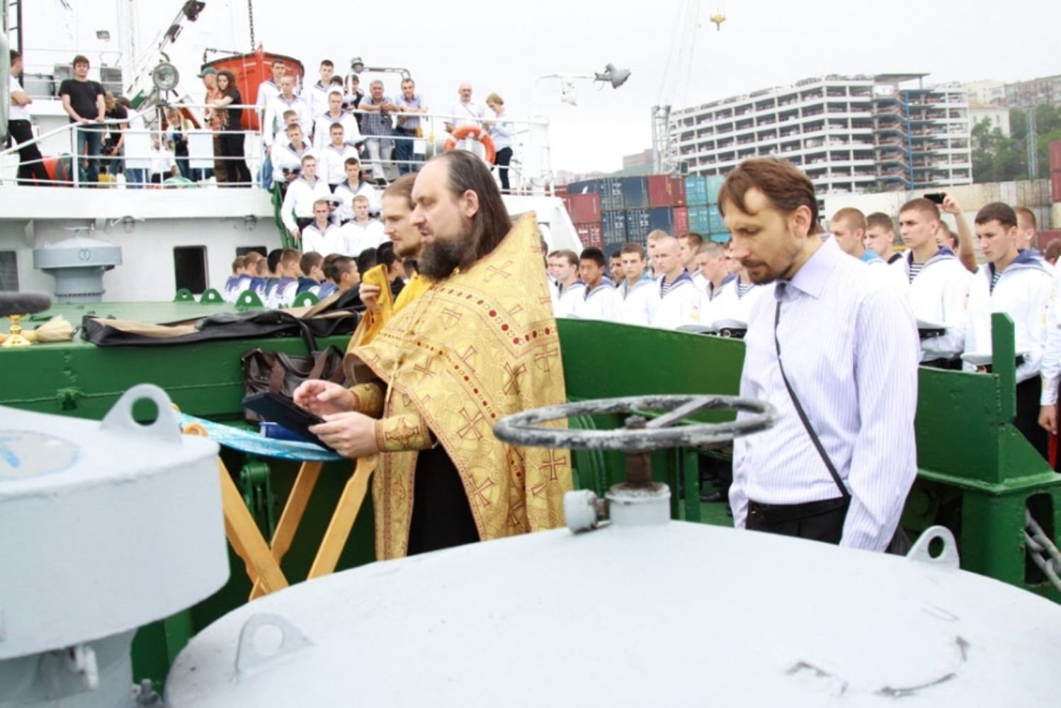 Владивостокскую епархию на церемонии, по благословению митрополита Владивостокского и Приморского Вениамина, представлял протоиерей Ростислав Мороз. Священник передал экипажу благословение Его Высокопреосвященства и совершил на борту судна молебен.