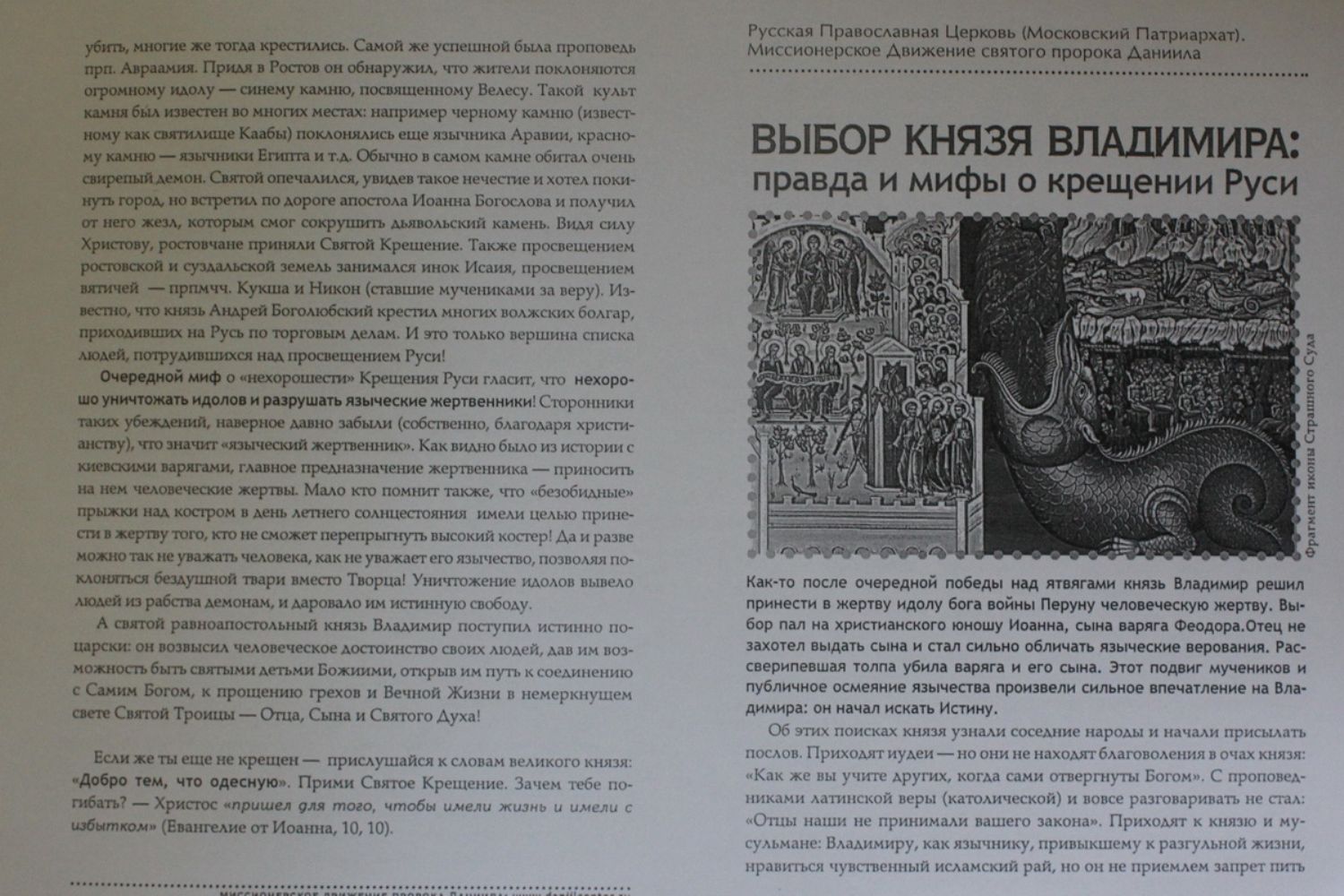 За образец организаторы взяли миссионерские листовки Центра святого пророка Даниила г. Москвы. Также дополнительную информацию о Крещении Руси активисты смогли найти на сайте миссионерского центра Даниила Сысоева.