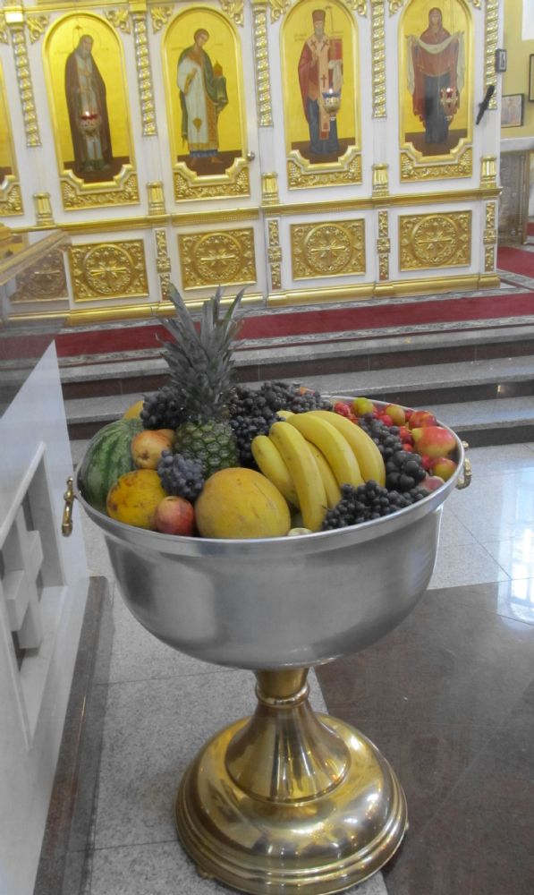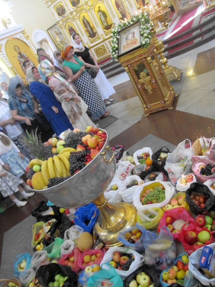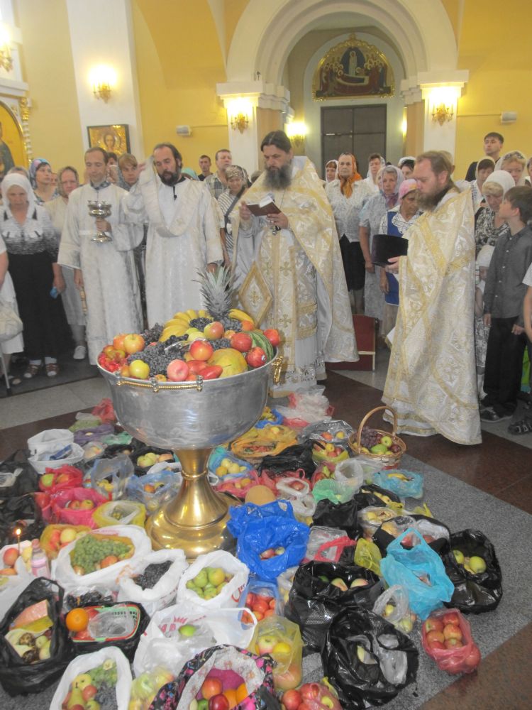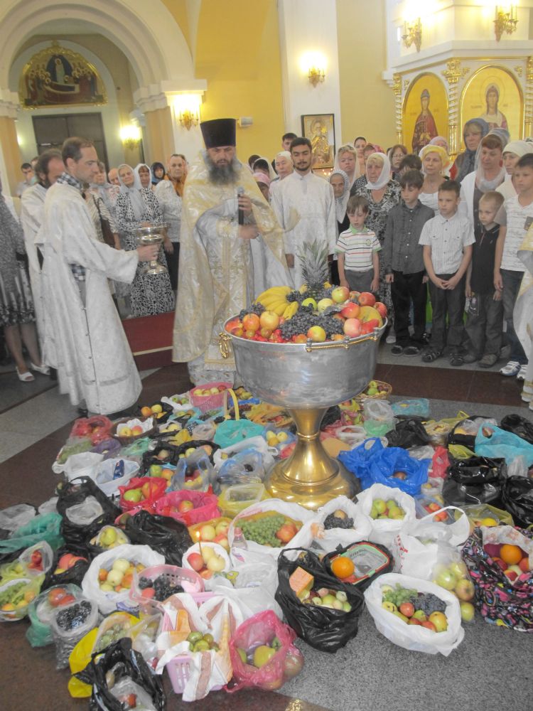 А в Покровский кафедральный собор для освящения принесли фрукты порядка полутора сотен прихожан. Праздничную Литургию и освящение плодов совершал, в сослужении духовенства, ключарь Покровского собора протоиерей Александр Талько.