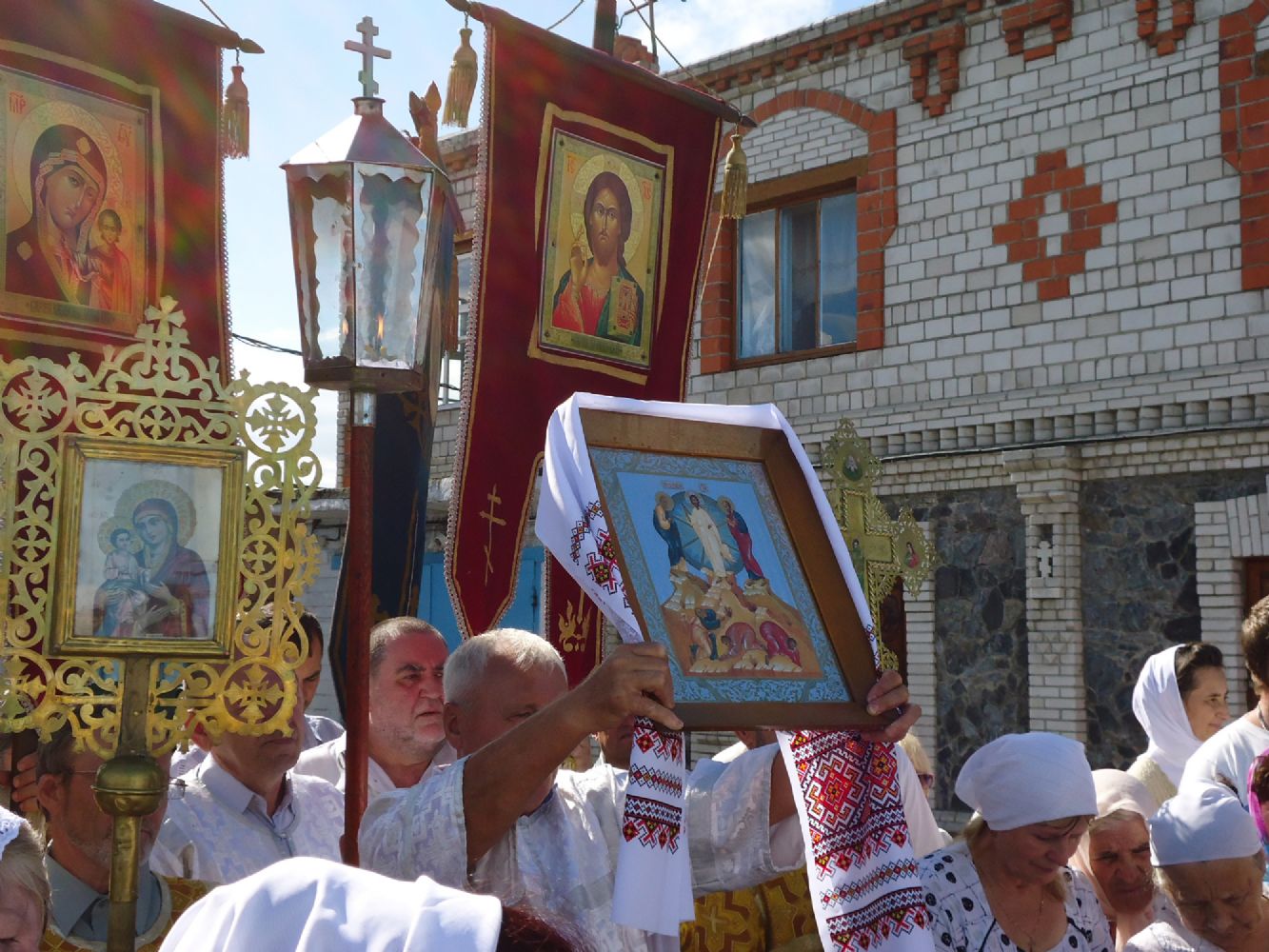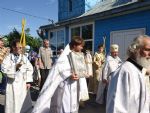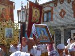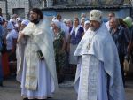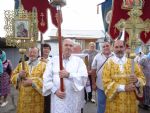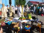 Затем митрополит Вениамин возглавил вокруг Преображенского храма праздничный Крестный ход, участниками которого стали порядка двухсот прихожан. И совершил освящение начатков плодов, которые были выставлены в корзинах на лотках во дворе храма.