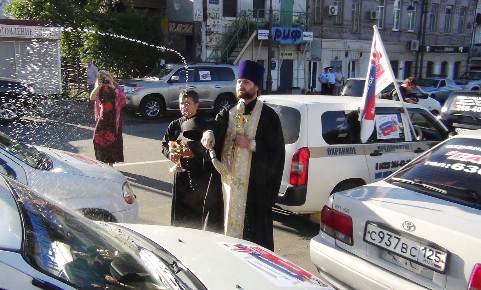 Затем благочинный I округа Владивостокской епархии о. Димитрий Федорин прочитал молитву о путешествующих, благословил участников автопробега и освятил их автомобили святой водой.