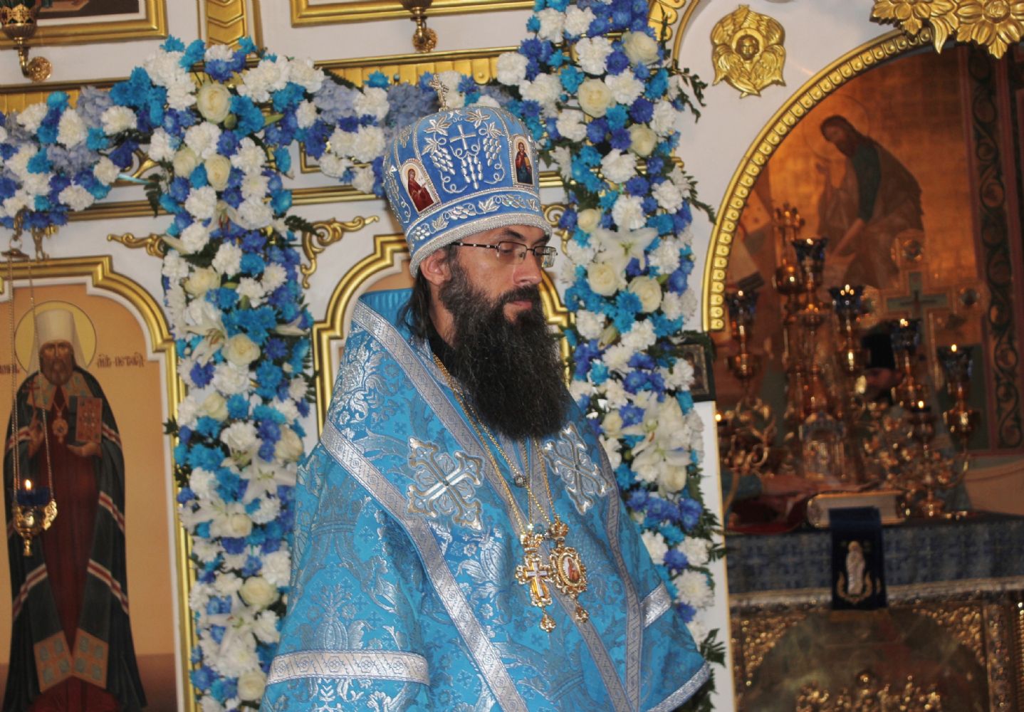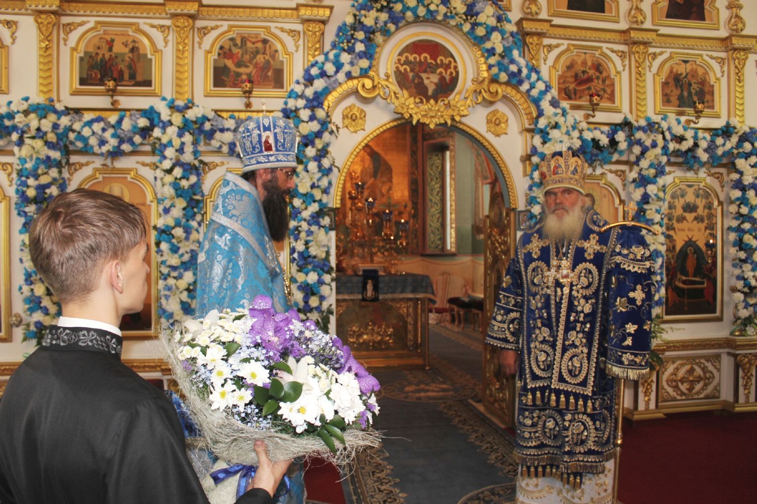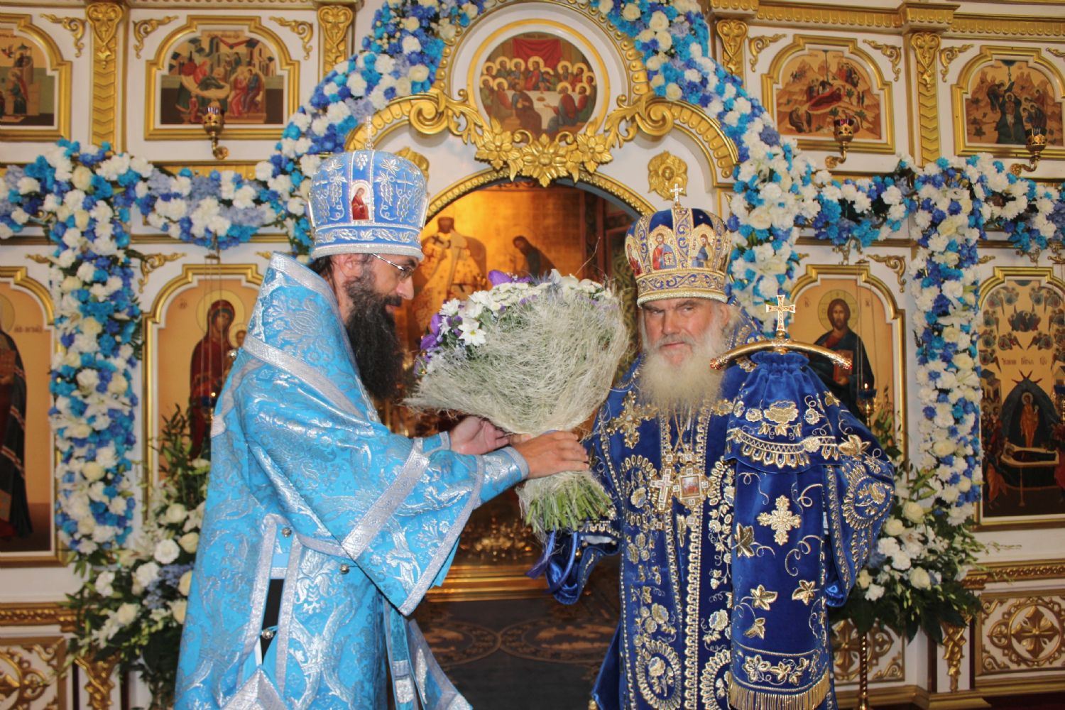 Также владыка Вениамин поздравил с престольным праздником настоятеля храма Успения Божией Матери Владивостока епископа Иннокентия, клир храма и его прихожан. В ответном слове епископ Иннокентий поблагодарил Высокопреосвященнейшего владыку за поздравления и от лица духовенства храма вручил ему праздничный букет. Иконостас и аналой храма в этот день украсили цветочные композиции.