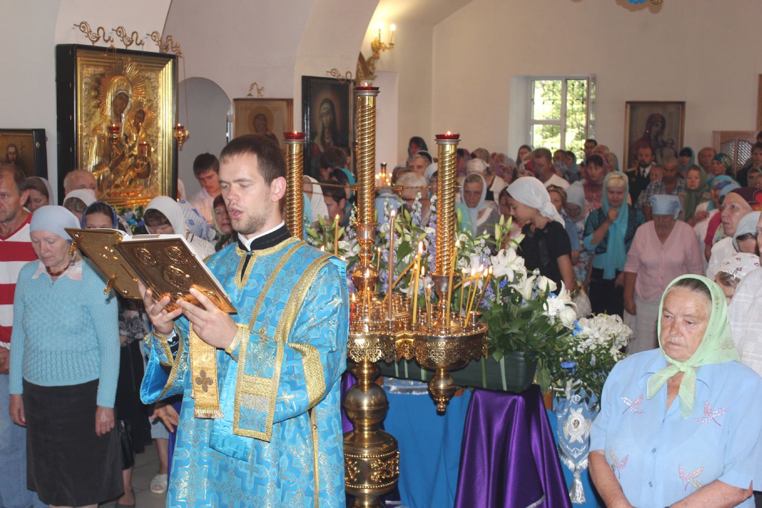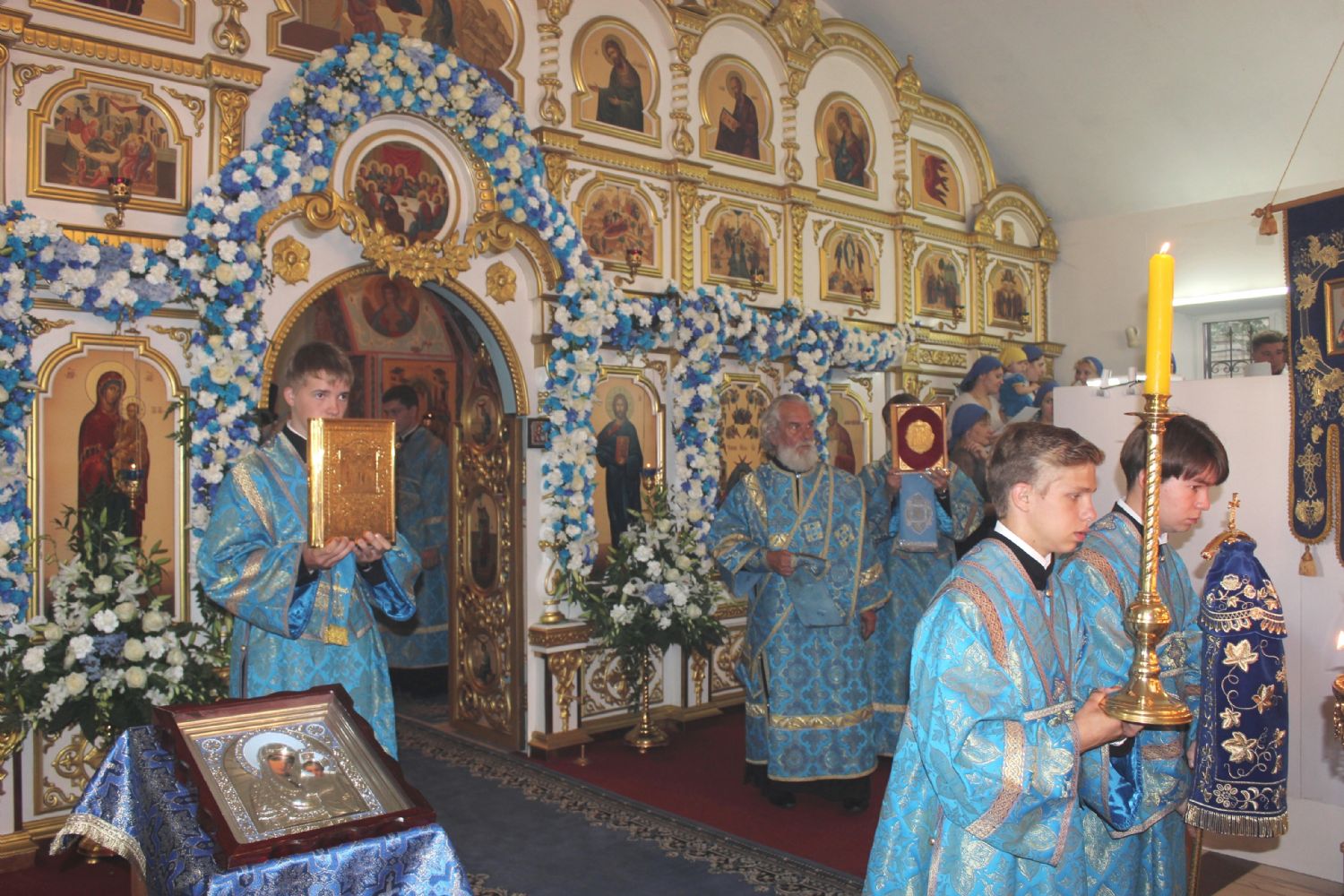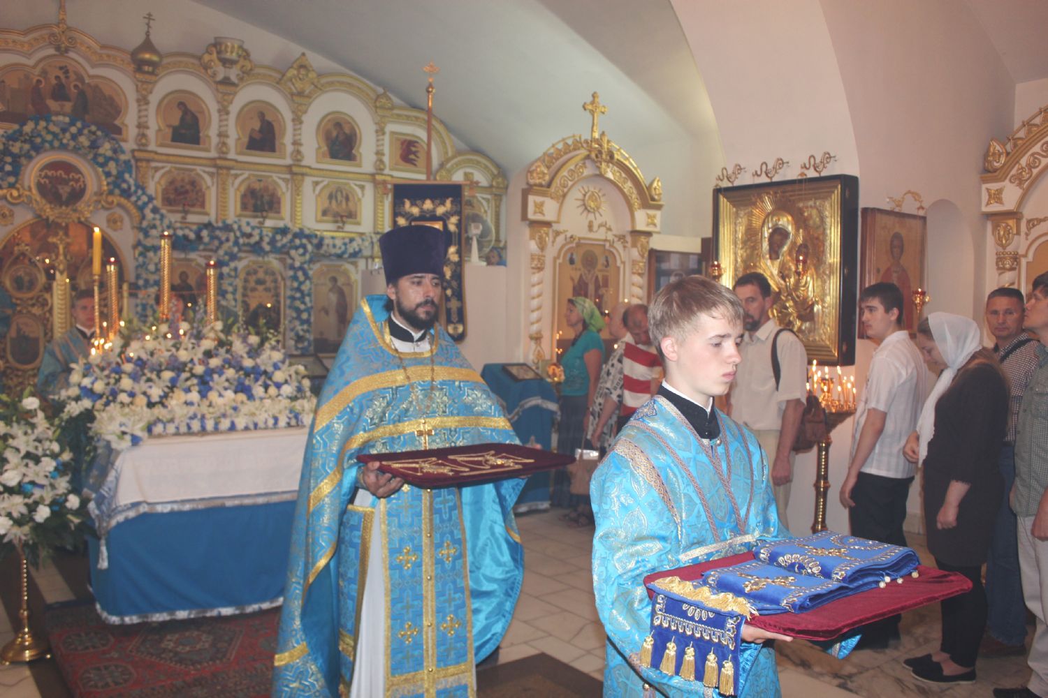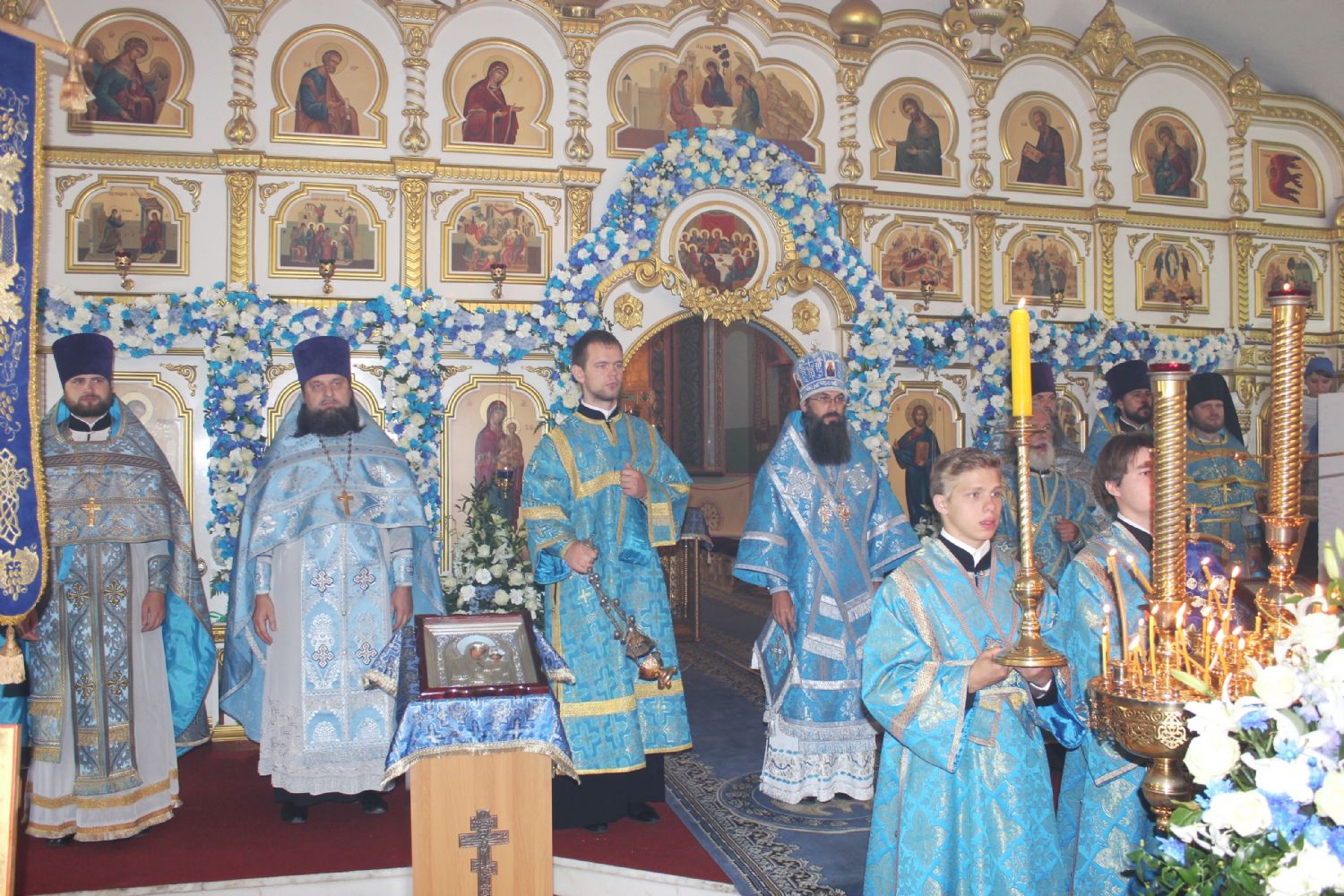 Также владыка Вениамин поздравил с престольным праздником настоятеля храма Успения Божией Матери Владивостока епископа Иннокентия, клир храма и его прихожан. В ответном слове епископ Иннокентий поблагодарил Высокопреосвященнейшего владыку за поздравления и от лица духовенства храма вручил ему праздничный букет. Иконостас и аналой храма в этот день украсили цветочные композиции.