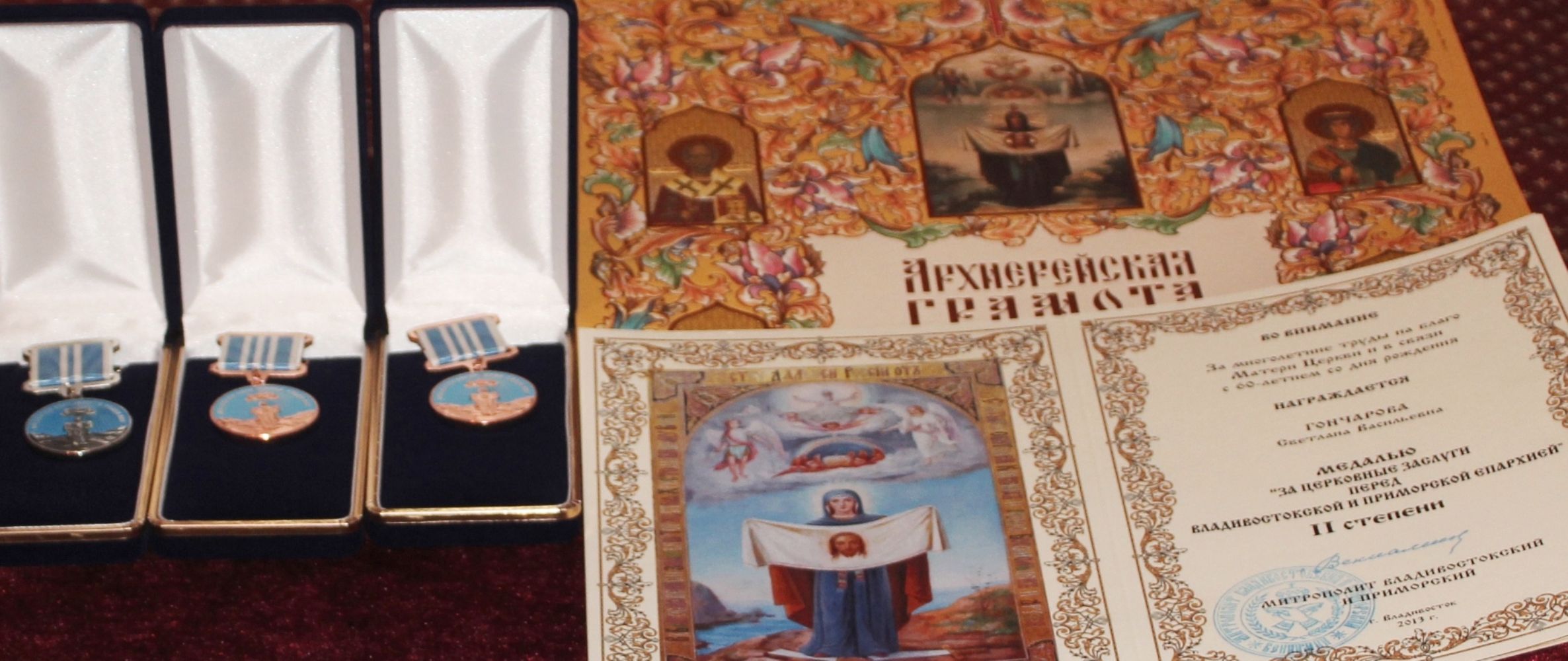 Медалью «За церковные заслуги перед Владивостокской и Приморской епархией» II степени была удостоена в связи с юбилеем бухгалтер храма Светлана Васильевна Гончарова.
