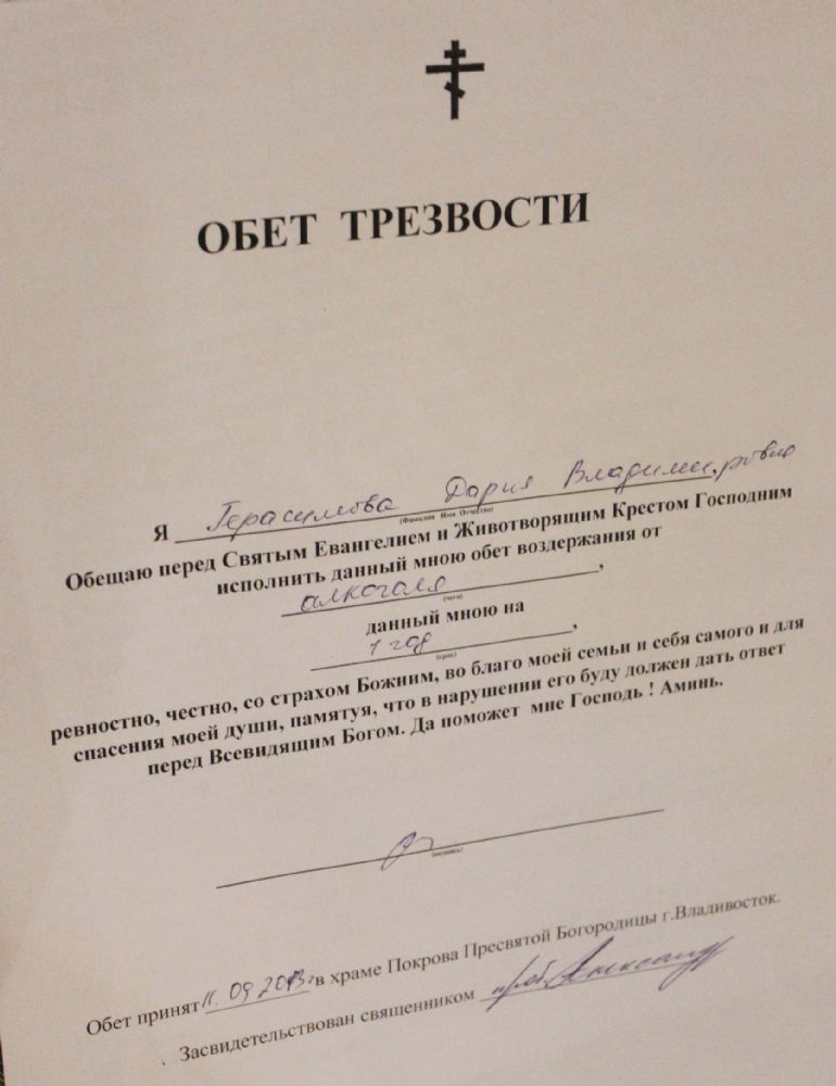 А на торжественном молебне в Покровском кафедральном соборе состоялось подписание обетных грамот. Акция трезвости состоялась на приходе после Божественной литургии, которую совершил ключарь храма протоиерей Александр Талько. В результате обет трезвости приняли 13 человек. Кроме обетных грамот, еще порядка 10 человек подписали согласия трезвости. Среди принявших обеты – несколько воспитанников епархиального Душепопечительского реабилитационного центра.