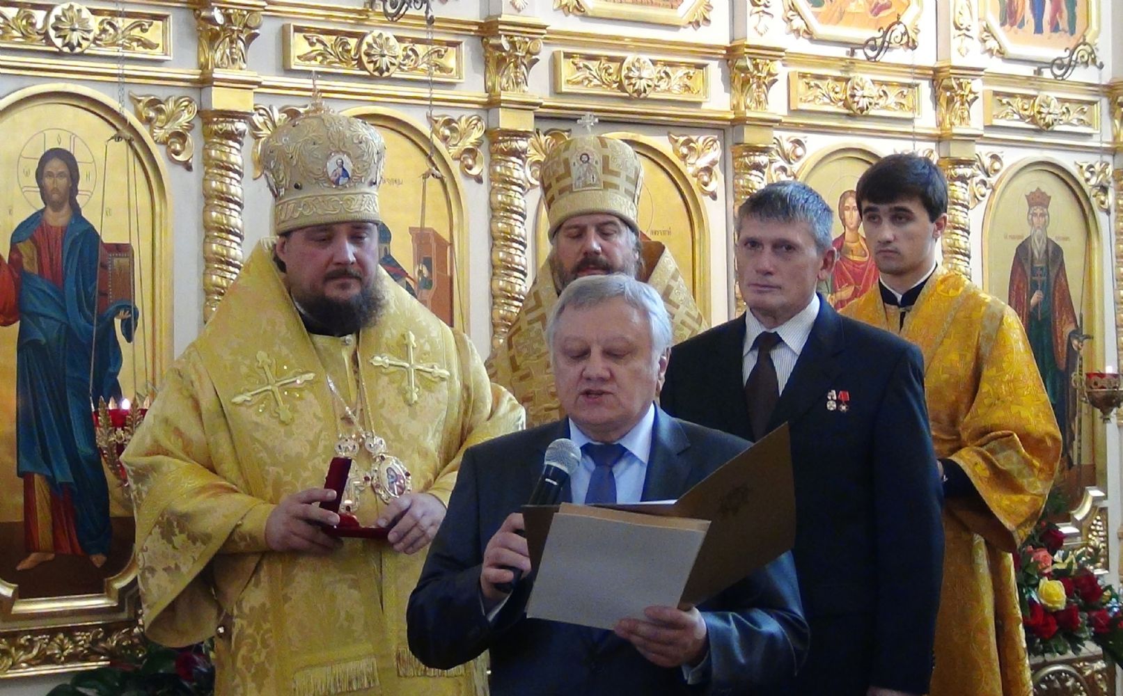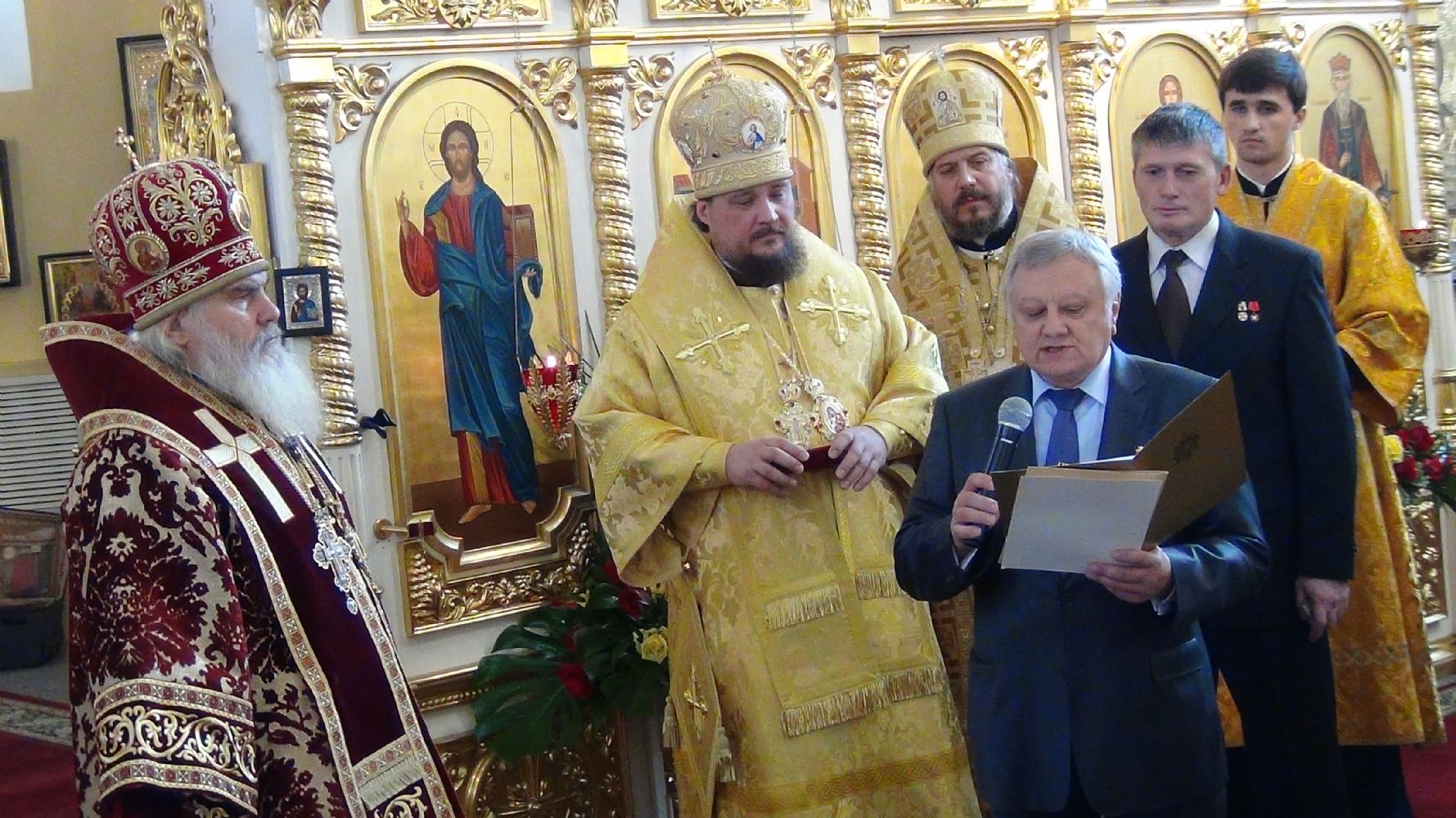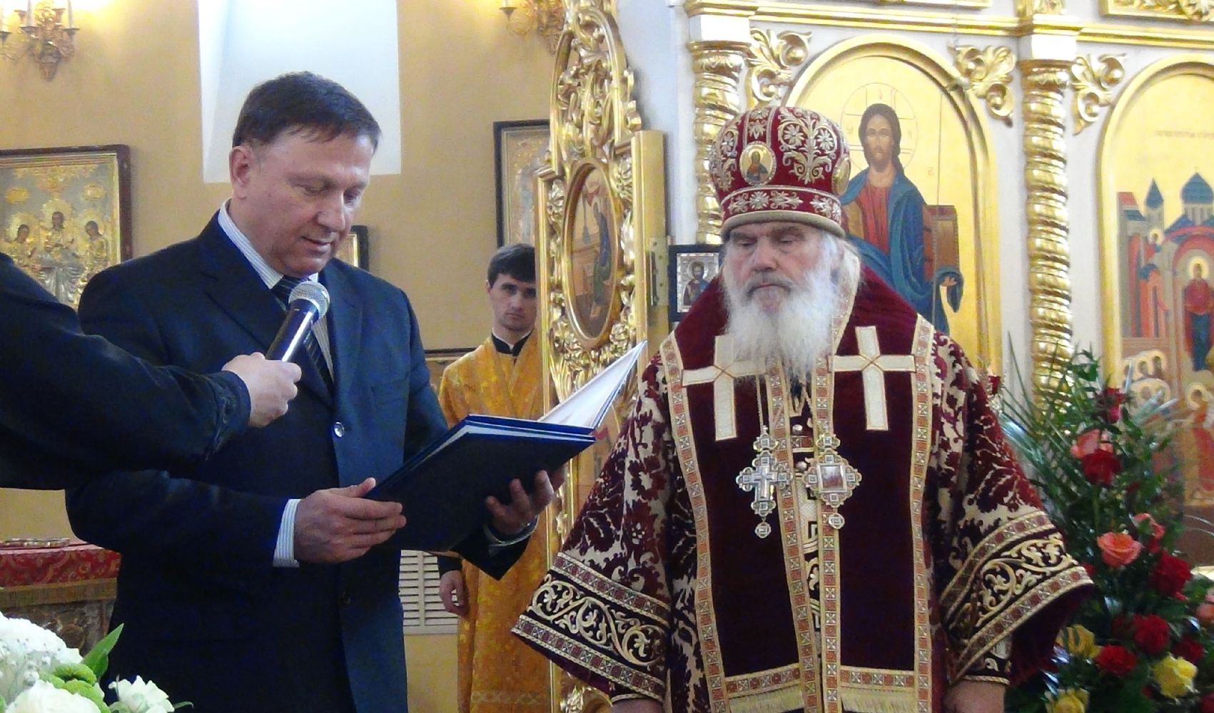 Представитель Дворянского и офицерского собрания Приморского края Виктор Васильевич Ильинов зачитал указ Е.И.В. Великой Княгини Марии Владимировны Романовой, Главы Российского Императорского Дома, и вручил митрополиту Владивостокскому и Приморскому Вениамину Императорский Орден Святой Анны II степени – за заслуги перед Отечеством и Русской Православной Церковью, во свидетельство особого благоговения и в ознаменование 75-летия со дня рождения.