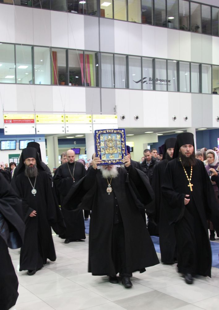В Международном аэропорту Владивосток (Кневичи) великую святыню встречали архиереи и собор духовенства Приморской митрополии: митрополит Владивостокский и Приморский Вениамин; епископ Уссурийский Иннокентий, викарий Владивостокской епархии; а также представители краевых властей, общественность и журналисты.