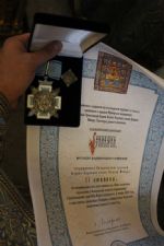- Мы рады быть в России, быть со своим народом, – сказал архиепископ Кирилл и зачитал грамоту: "По постановлению Святейшего Синода Русской Православной Церкви Заграницей во внимание к усердным трудам и в связи с 75-летим со дня рождения и с принесением в пределы Приморской митрополии Курской Коренной иконы Божией Матери "Знамение" – Одигитрии (путеводительницы) русского рассеяния Высокопреосвященнейший владыка Вениамин, митрополит Владивостокский и Приморский награждается синодальным орденом Курской Коренной иконы Божией Матери II степени. Во свидетельство сего дана грамота сия, нами надлежаще подписанная и Синодальною печатью утверждённая в Богоспасаемом граде Нью-Йорке в воскресенье, 3 ноября 2013 года, в день памяти преподобного Иллариона, схимника Киево-Печерского, митрополита Киевского и всея Руси".