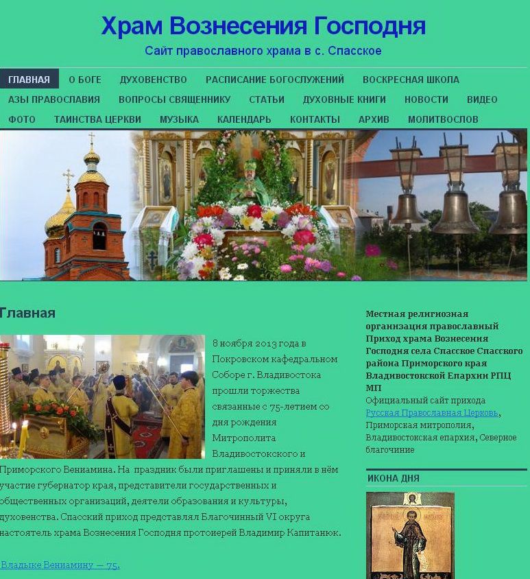 Приход храма Вознесения Господня в Спасске-Дальнем – селе Спасское – открыл свой сайт. Он посвящён рассказу о жизни прихода. Кроме того сайт ориентирован на просветительскую работу среди верующих, и в первую очередь, среди молодежи, которая в наш век привыкла черпать информацию из интернета. И новообращённым, и воцерковлённым посетителям сайта помогут разделы: «О Боге», «Азы Православия», «Статьи», «Духовные книги», «Молитвослов», «Таинства Церкви», «Музыка», «Православный календарь». Есть страничка Воскресной школы, а так же возможность задать вопрос священнику. Для детей есть православные мультфильмы, для взрослых – документальные фильмы. На сайте публикуется расписание Богослужений в храме Вознесения Господня.