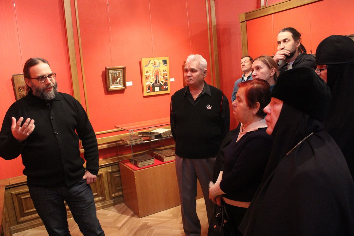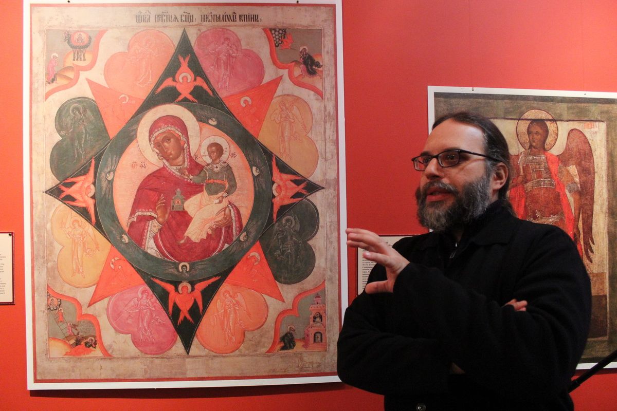 Затем выступил протоиерей Александр Салтыков, декан факультета церковных художеств Православного Свято-Тихоновского гуманитарного университета (ПСТГУ), старший научный сотрудник Музея древнерусской культуры и искусства имени преподобного Андрея Рублёва, настоятель храма Воскресения Христова в Кадашах, член Союза художников России, известный искусствовед, автор большого числа публикаций по вопросам церковного искусства. Около пятидесяти лет он посвятил музейной работе. "Сейчас мы открываем не просто музейную выставку, а выставку церковного искусства, произведений древности," – сказал протоиерей Александр.