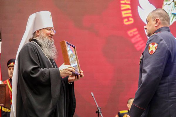 Владыка напомнил, что двери всех храмов города всегда открыты для росгвардейцев, и пригласил сотрудников Федеральной службы на экскурсию в Спасо-Преображенский собор. В завершение своего выступления правящий архиерей преподнёс в дар личному составу икону Спасителя Иисуса Христа.