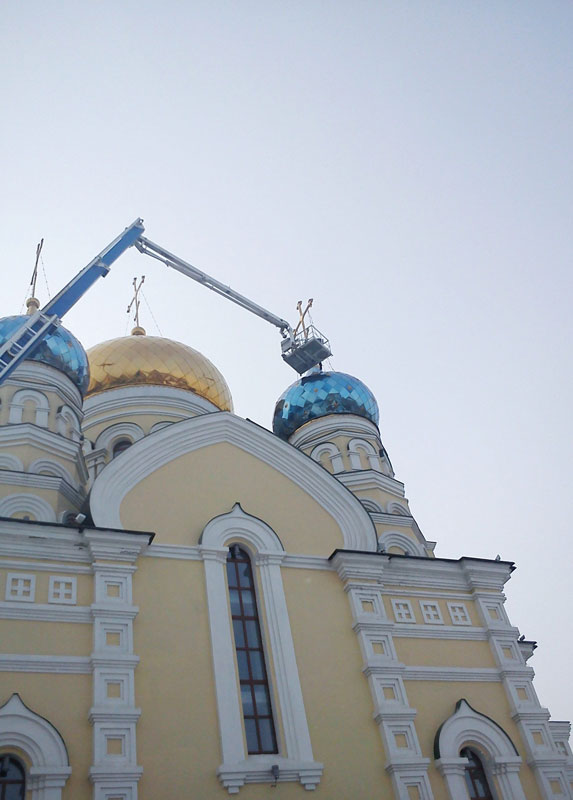 Владивосток. На один из куполов кафедрального собора Покрова Божией Матери, после ремонтных работ, установлен накупольный крест.