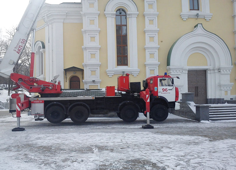 Для высотных работ привлекли специальную технику – пожарный кран, предоставленный Управлением МЧС по Приморскому краю.