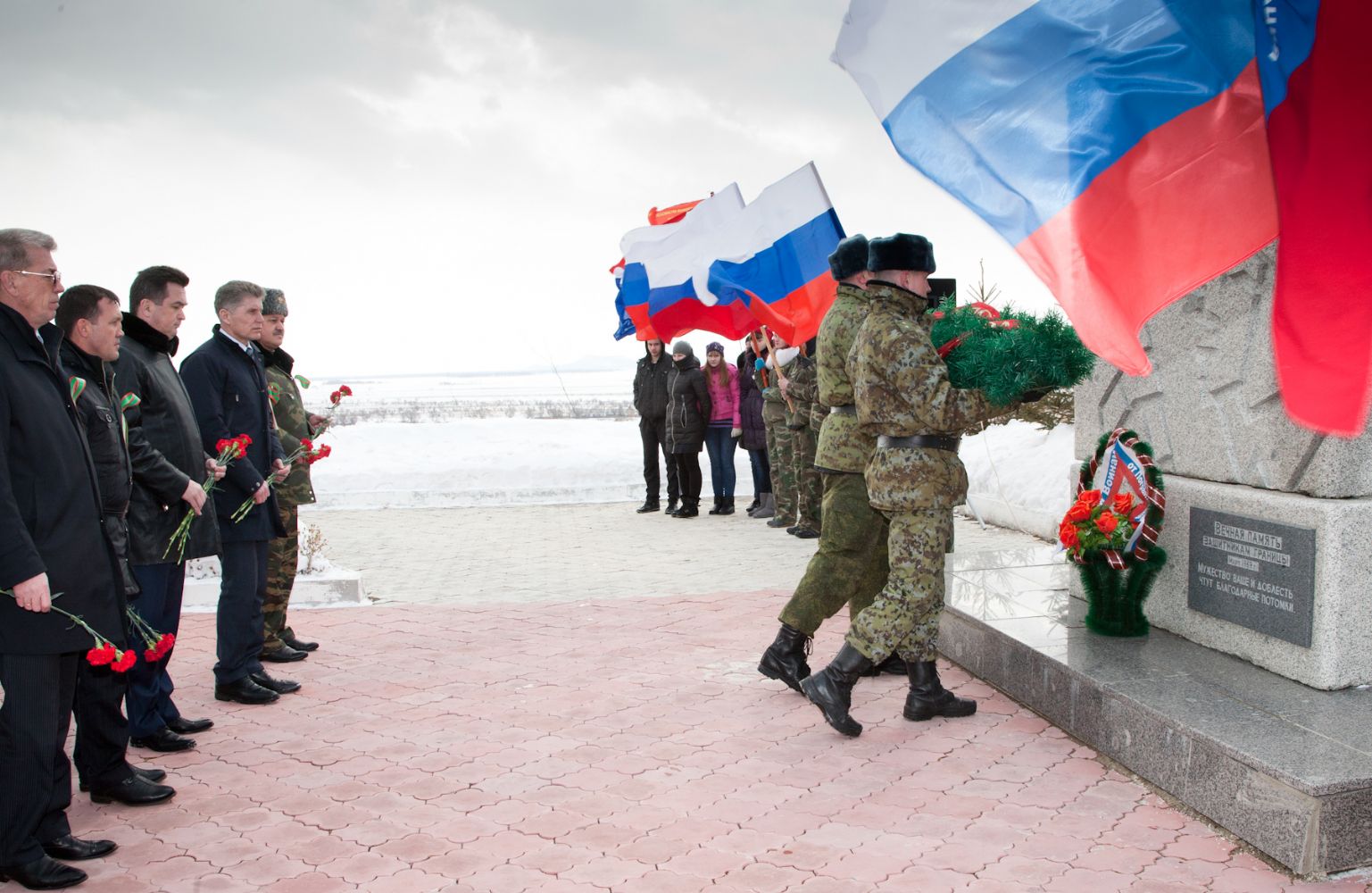 - Памятные мероприятия прошли и в пограничных отделениях Даманское и Нижнемихайловское. Участники делегации встретились с воинами-пограничниками, почтили память погибших героев, возложили красные гвоздики на льду пограничной реки Уссури между Россией и Китаем.