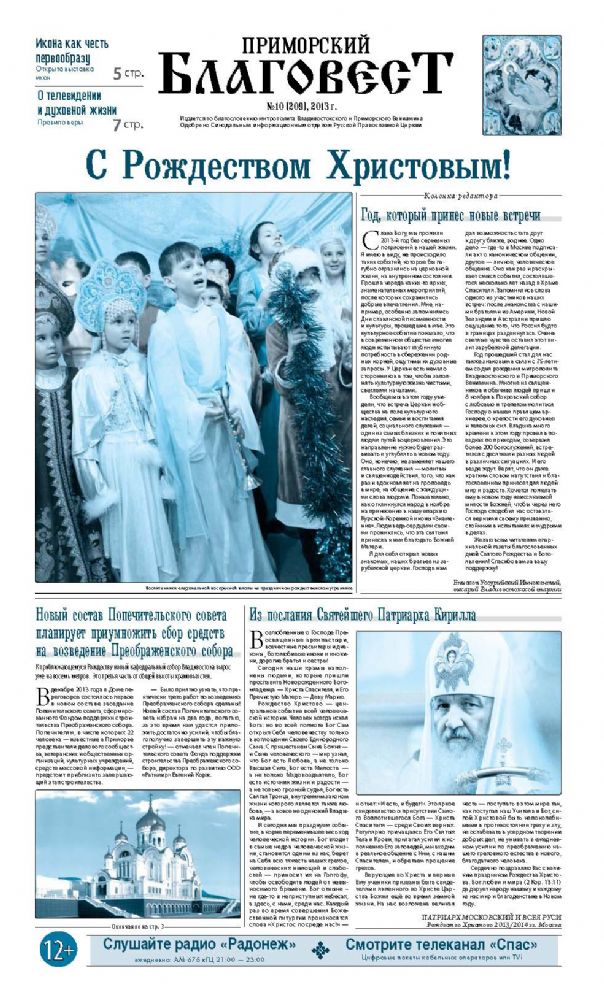 В номере опубликованы поздравления с приближающимся светлым праздником – Рождеством Христовым – Святейшего Патриарха Московского и всея Руси Кирилла; и митрополита Владивостокского и Приморского Вениамина.