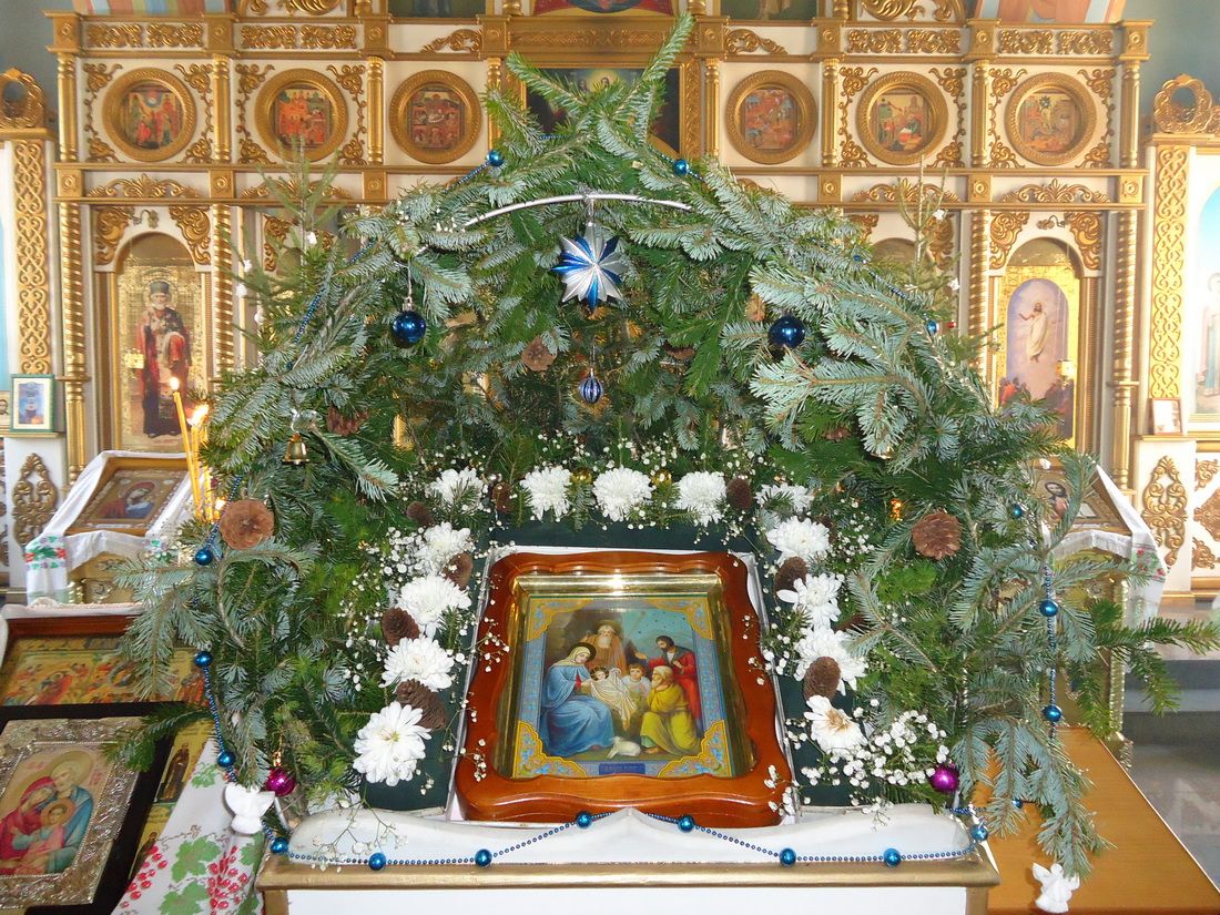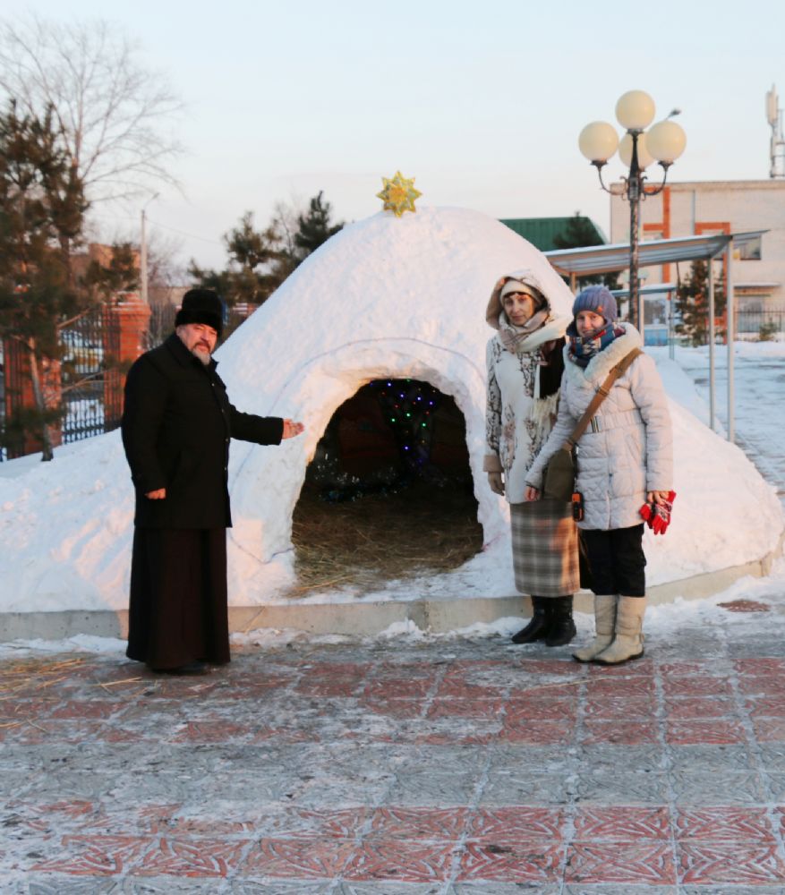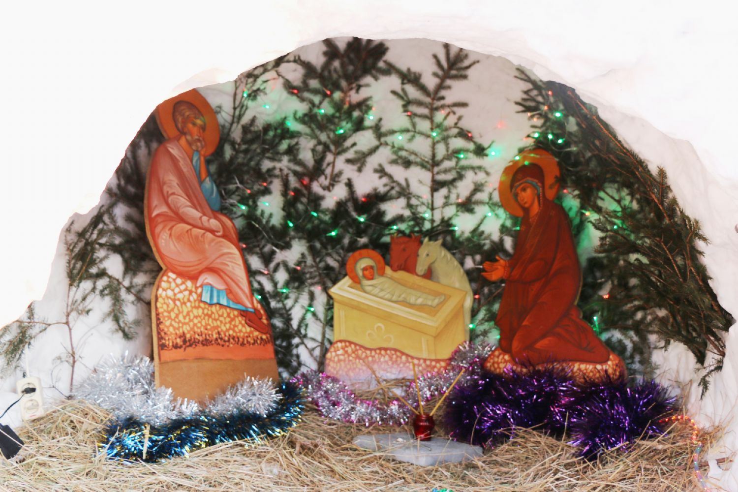 В храме Вознесения Господня с. Спасское к празднику готовились задолго: сложили вертеп из снега, залили ледяную горку, подготовили зал будущей Воскресной школы для представления, нарядили ёлку. Всё украсили иллюминацией.