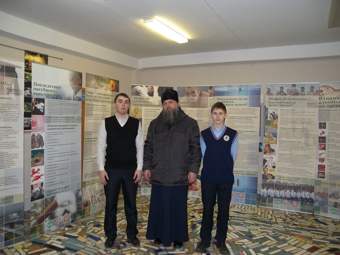 Владивосток, 13 февраля 2014. В рамках Президентской программы "Здоровье нации" Морской колледж посетили председатель общества православных врачей Владивостока, руководитель Душепопечительского центра в честь святого праведного Иоанна Кронштадтского по реабилитации нарко- и алкоголезависимых протоиерей Александр Талько и психолог Елена Волошина. Курсантов ознакомили с выставкой, информирующей о последствиях табакокурения, употребления алкоголя и наркотиков.