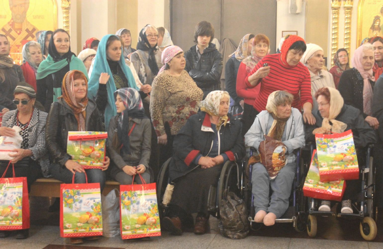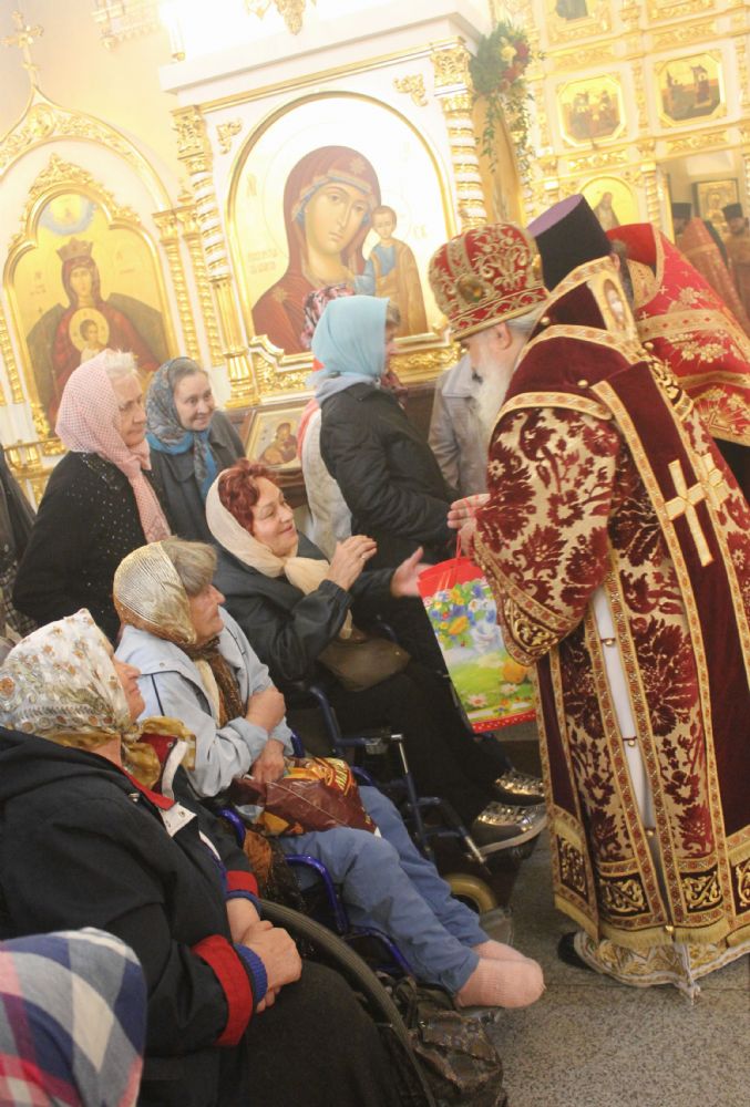 - Такая акция на Пасху становится доброй традицией. При содействии добровольцев епархиального отдела по социальному служению в храм для соборной молитвы доставляются инвалиды-спинальники. Владыка Вениамин особо благословил немощных прихожан и преподнес им небольшие подарки – символы пасхальной радости – крашеное яйцо и куличики.