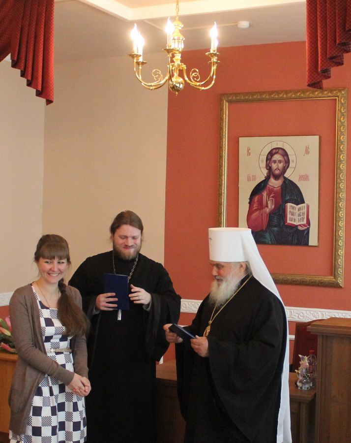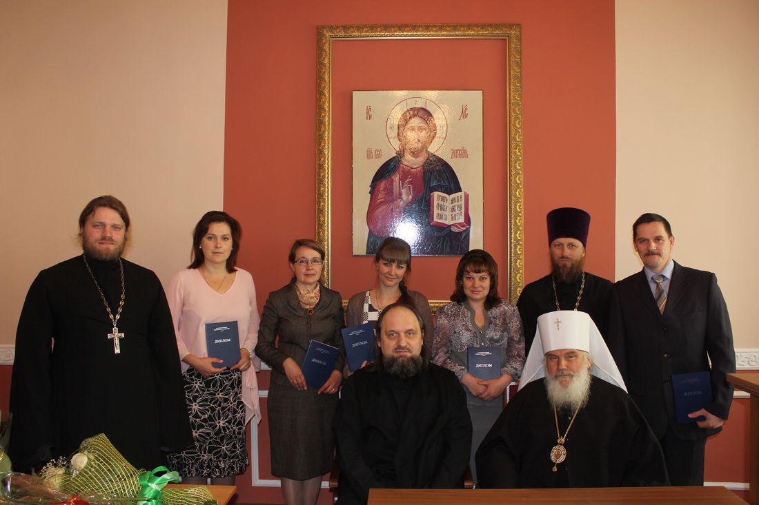 Дипломы были вручены студентам вечернего и заочного отделений, получавшим второе высшее образование. После двух лет обучения остались самые стойкие – дипломы получили восемь выпускников. Среди них протоиерей Андрей Метелёв, клирик храма в честь святых равноапостольных Кирилла и Мефодия, руководитель епархиальной комиссии по вопросам семьи, защиты материнства и детства и Светлана Николаевна Брижак специалист епархиального отдела образования, руководитель просветительского Центра «Слово истины».