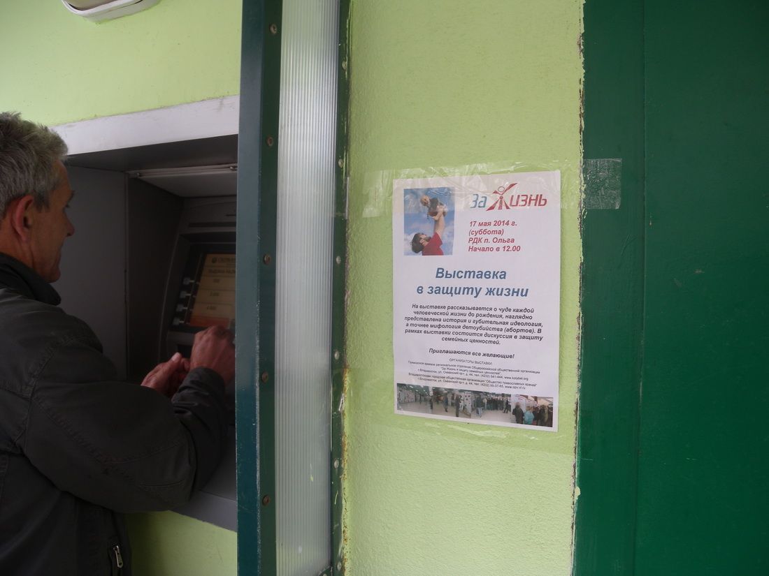 Посёлки Ольга и Кавалерово. В минувшие выходные в преддверии Дня защиты детей пролайферы (борцы с абортами) из Владивостока – православный врач, клинический психолог, сотрудник Центра защиты материнства «Колыбель» Елена Владимировна Волошина и Председатель Совета Приморской Краевой Общественной Российской организации "За жизнь и защиту семейных ценностей" Дмитрий Иванов. В посёлке Ольга их встретил священник Георгий Койчубаев. В посёлке заранее подготовились к встрече пролайферов из Владивостока, разместили объявления о встрече.