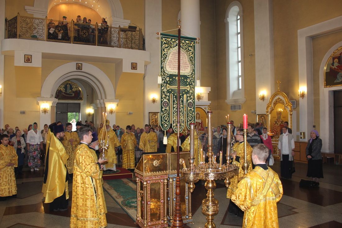 Затем хоругвь торжественно вынесли из храма. Далее автомобилем хоругвь была перенесена в Никольский собор, где она будет находиться до 21 июня. Сопровождал святыню благочинный I благочиния иерей Димитрий Федорин.
