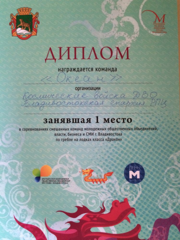 Владивосток. В выходные на набережной Спортивной гавани состоялись состязания между гребцами-любителями, приуроченные ко Дню молодежи. 72 команды (792 человека) вышли на воду побороться за кубок, учрежденный администрацией г. Владивостока. Владивостокскую епархию представляла команда «Океан». В команду вошли выпускники Духовного училища и Православной гимназии в содружестве с прихожанами храмов и представителями военных. Экипаж лодки - 10 человек.