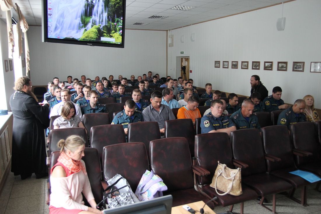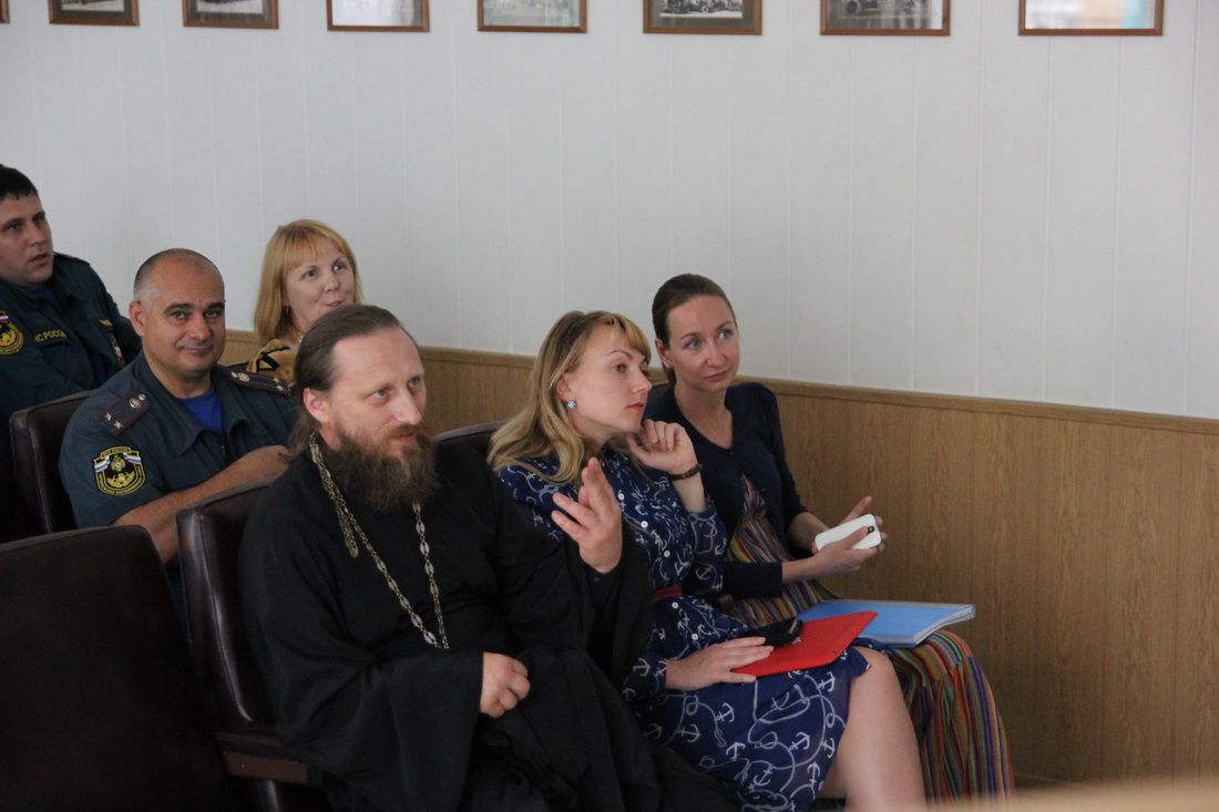 К сотрудникам МЧС обратились заместитель директора Департамента внутренней политики Приморского края Олеся Витальевна Некрасова и председатель Совета отцов Приморского края Александр Табаченко.