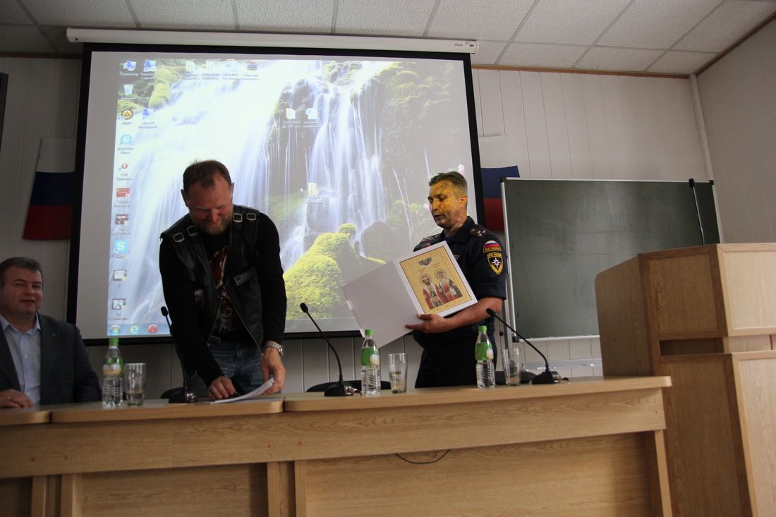 В завершении встречи Андрей Юрьевич Коченов вручил начальнику управления организации пожаротушения и аварийно-спасательных работ Главного управления МЧС России по Приморскому краю полковнику внутренней службы Игорю Швецу написанную специально к мотопробегу икону святых благоверного великого князя Димитрия Донского и его супруги преподобной Ефросинии Московской, на которой они впервые изображены вместе. У святых супругов было 12 детей. Для личного состава передали буклеты, изданные к мотопробегу, где собраны интересные и полезные сведения для главы семьи.