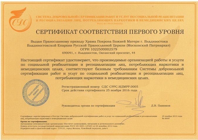 Душепопечительский центр святого праведного Иоанна Кронштадтского при Покровском кафедральном соборе во Владивостоке получил сертификат на соответствие базовым требованиям Системы добровольной сертификации услуг по социальной реабилитации и ресоциализации лиц, потребляющих наркотики в немедицинских целях.