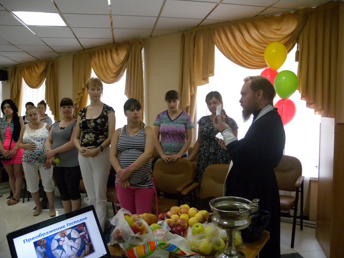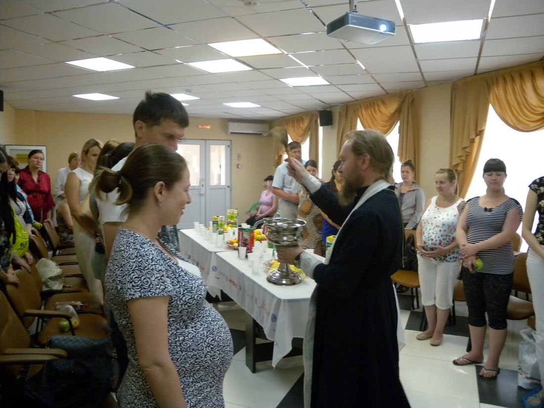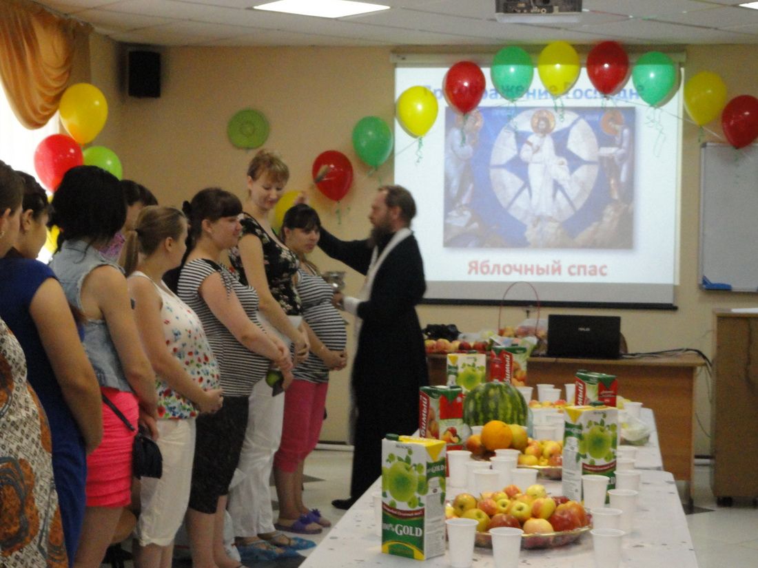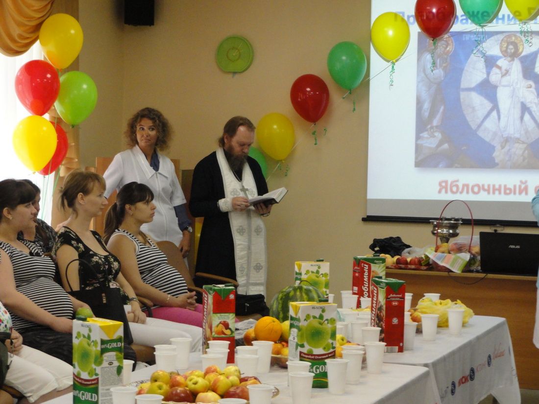 Священник рассказал гостям о празднике Преображения Господня, о том, почему его называют Яблочным Спасом. Батюшка Антоний освятил яблоки, ставшие народным символом праздника, и благословил женщин на легкие роды и счастливое материнство. Игумену Антонию помогала клинический психолог Центра защиты материнства "Колыбель" Елена Владимировна Волошина.