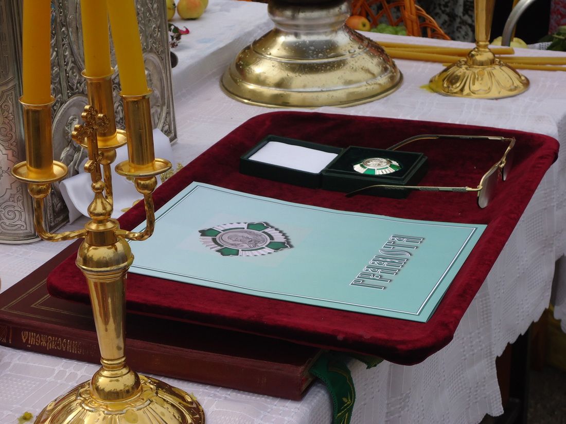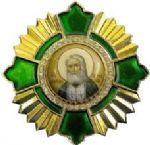Наша справка: Орден преподобного Серафима Саровского учреждён определением Патриарха Московского и всея Руси Алексия II и Священного Синода в 2004 году в ознаменование 100-летия канонизации преподобного Серафима Саровского, и имеет три степени. Знак ордена представляет собой латунный четырёхконечный крест с расширяющимися концами и клиновидным завершением, покрытый зелёной эмалью. По краям креста — узкий выпуклый рант. На лицевой стороне знака, в центре - круглый медальон с погрудным образом святого преподобного Серафима Саровского.
