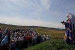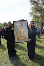 Владыка Вениамин передал участникам Епархиального Крестного хода икону, хоругвь и ковчег с частицей мощей преподобного Сергия Радонежского.