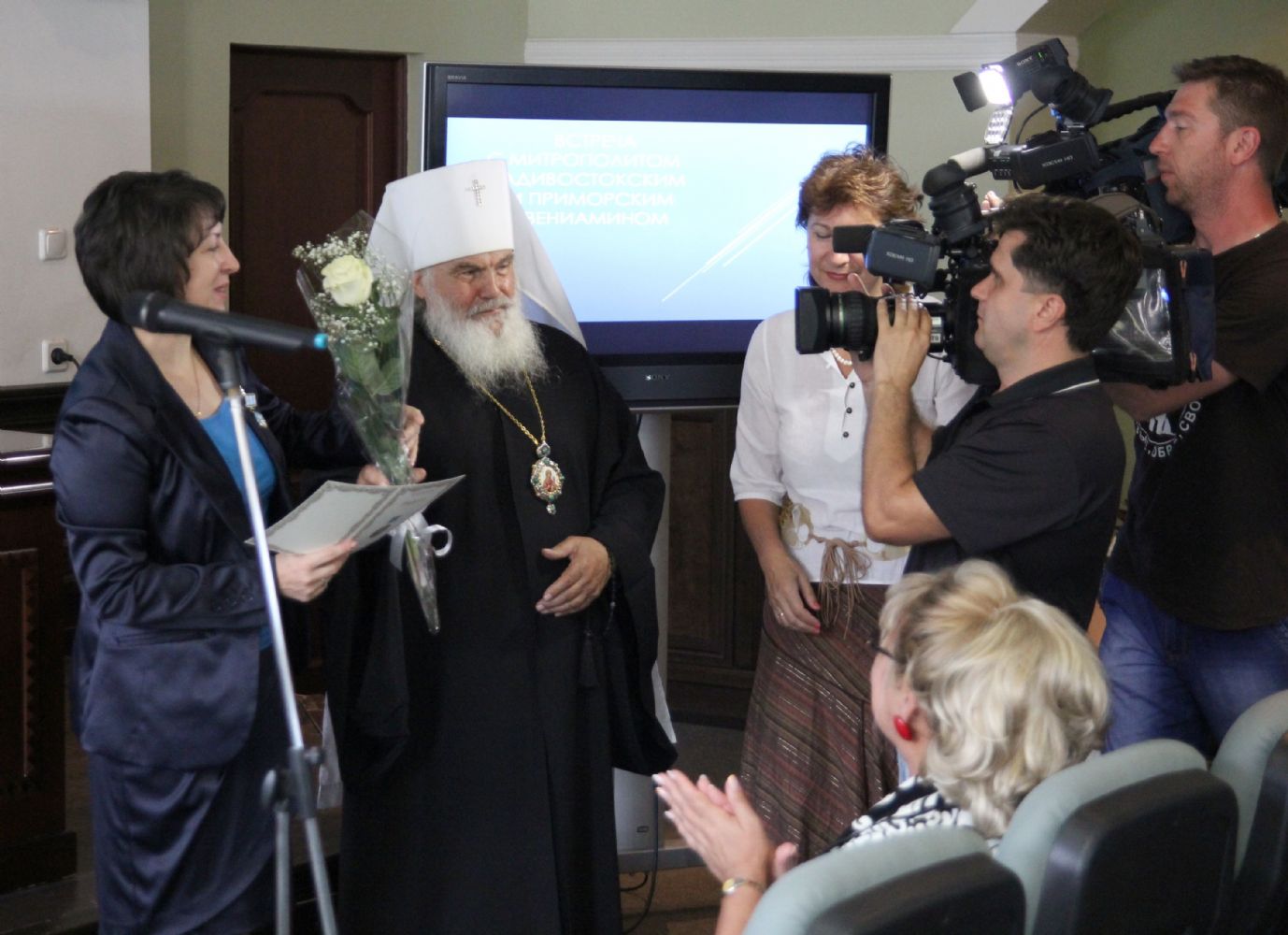 В знак внимания к успешному взаимодействию с педагогическим сообществом, митрополит Вениамин вручил работникам образования ряд епархиальных наград и архиерейских грамот. Так, и.о.директора департамента образования и науки Приморского края Елена Алексеевна Григорьева была удостоена медали «За церковные заслуги перед Владивостокской и Приморской епархией» I-й степени.