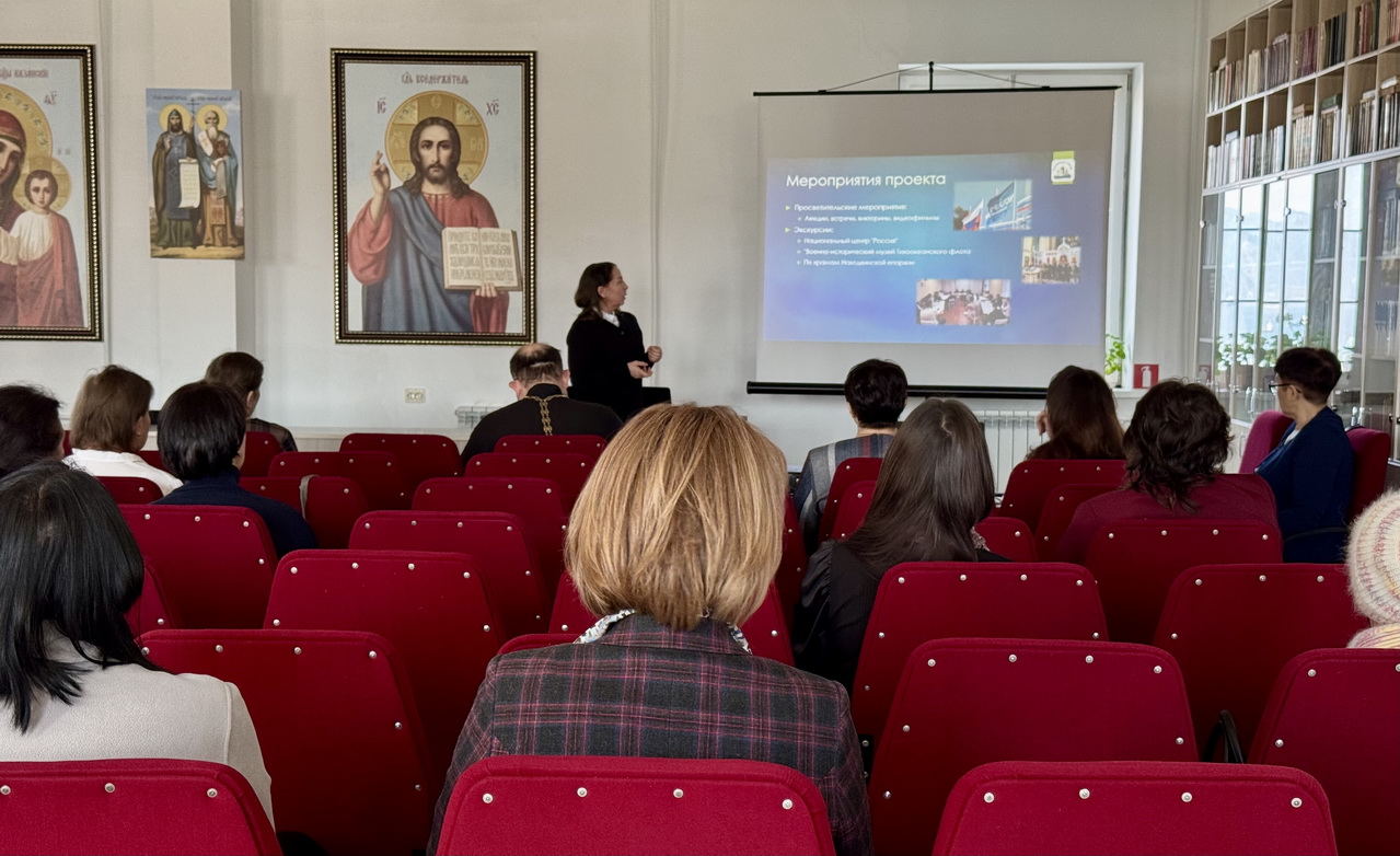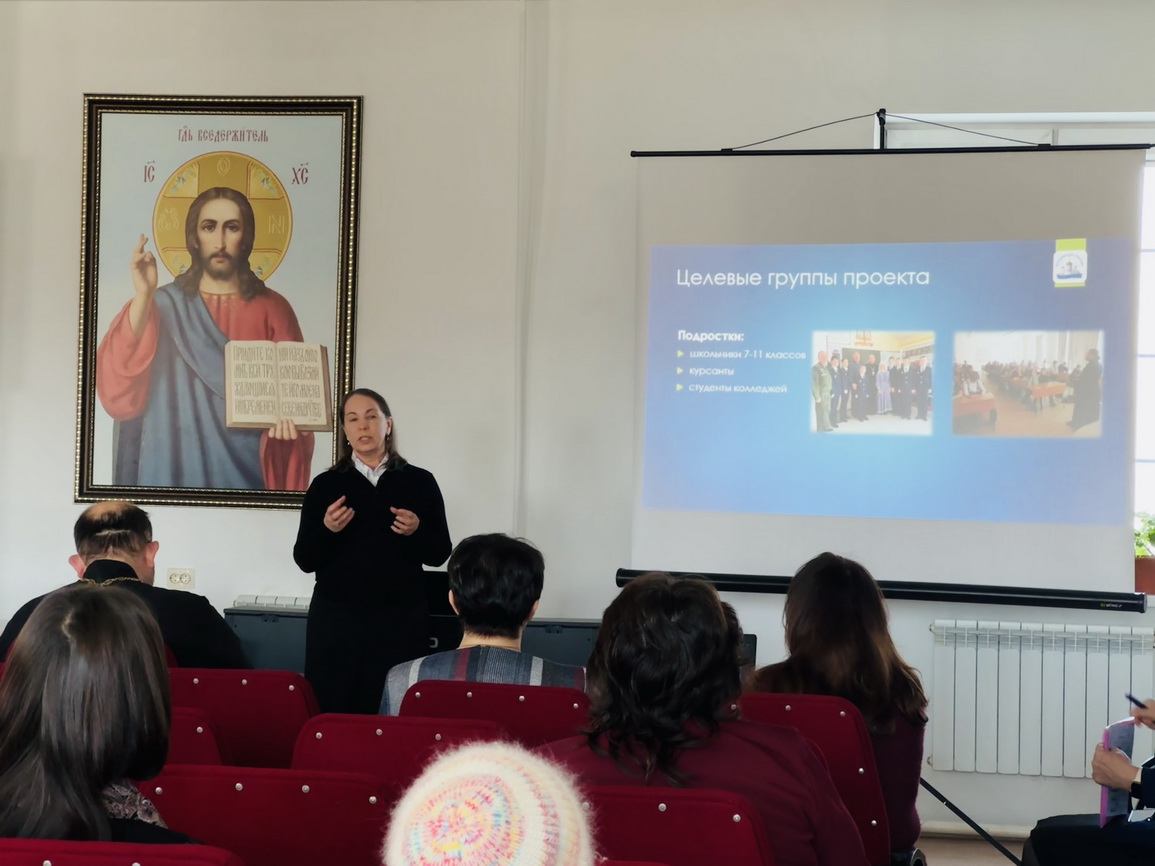 Руководитель грантовых епархиальных проектов Паначева Эльвира представила презентацию проекта «Помним историю, сохраняем традиции», получившего поддержку Гранта Губернатора Приморья. Проект направлен на укрепление духовно-нравственных ценностей, гражданского самосознания, повышение исторической грамотности о героическом прошлом и настоящем нашего Отечества. Целевая группа проекта — школьники 7-11 классов, студенты и курсанты Находкинского городского округа, г. Партизанска, г. Фокино и г. Большой Камень.