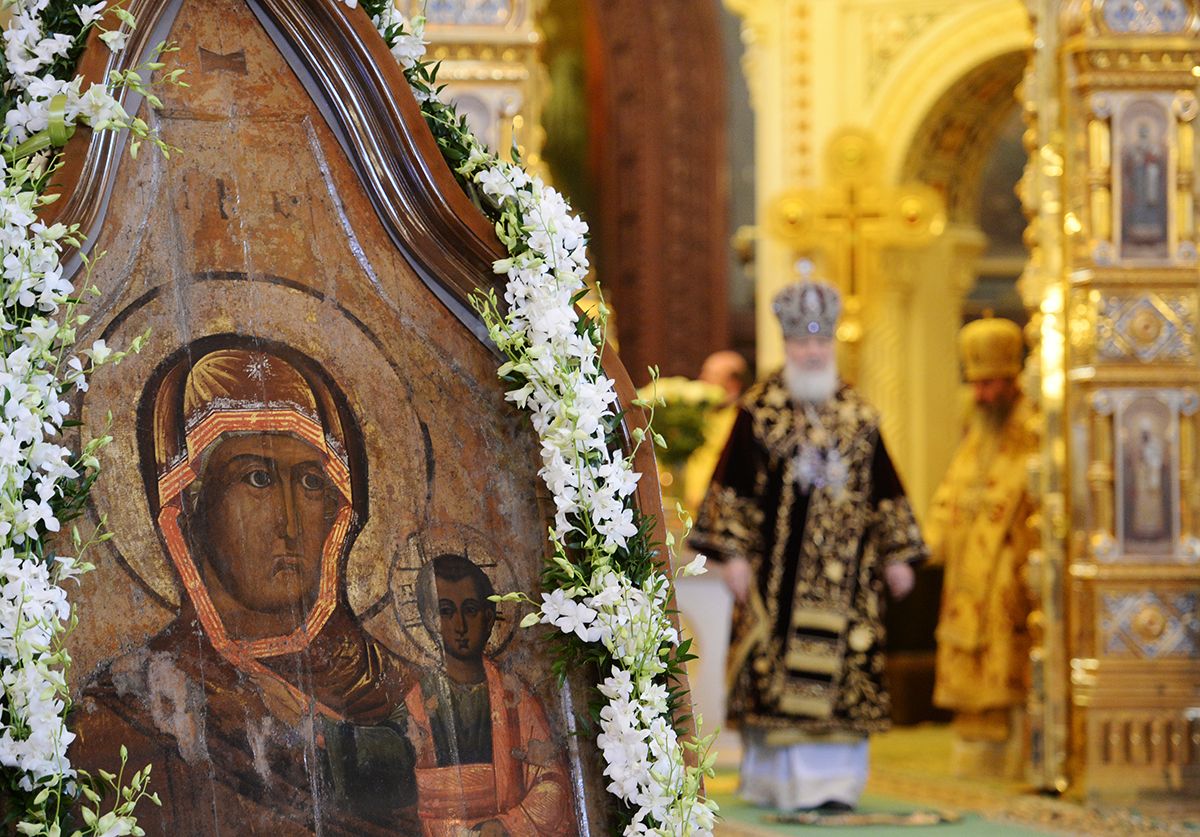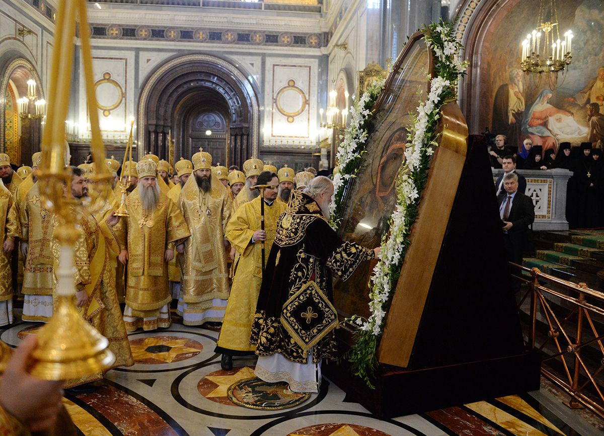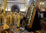 По благословению Святейшего Патриарха Кирилла к богослужению после реставрации была принесена чудотворная Смоленская икона Божией Матери «Одигитрия». После сугубой ектении Предстоятель Русской Церкви вознес молитву о мире на Украине.