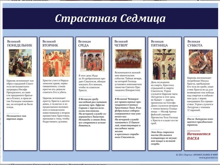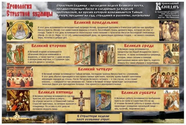 — Весь Великий пост готовит к встрече Страстной седмицы. В течение поста в храме читаются книги Ветхого Завета, а в первые три дня Страстной седмицы устав предписывает в храме прочитывать полностью все четыре Евангелия (на практике чтение начинается за неделю или две до Страстной). Многие православные христиане прочитывают за пост все Евангелие.