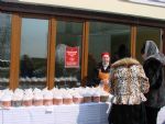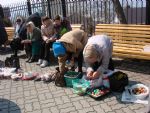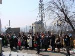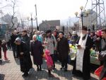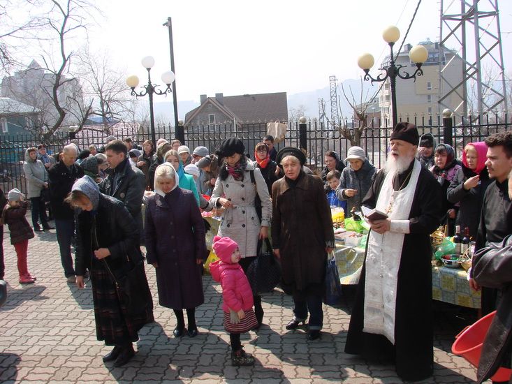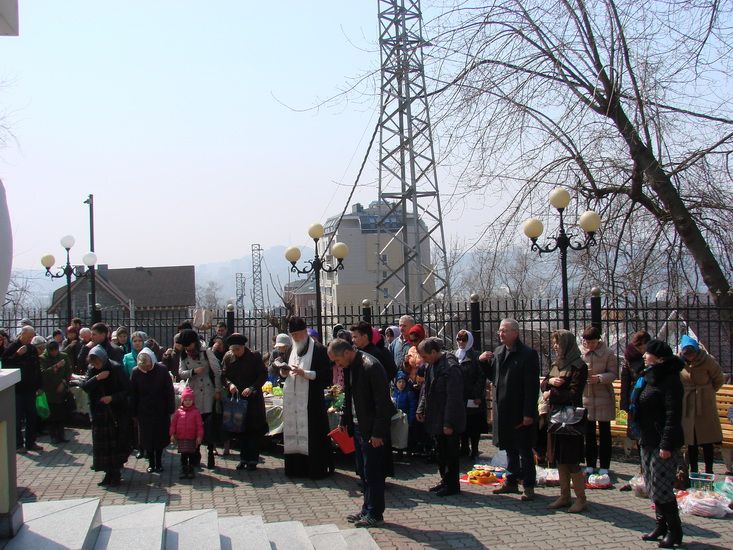 По древней традиции, после богослужения во дворе Никольского собора освятили куличи и пасхальные яйца.