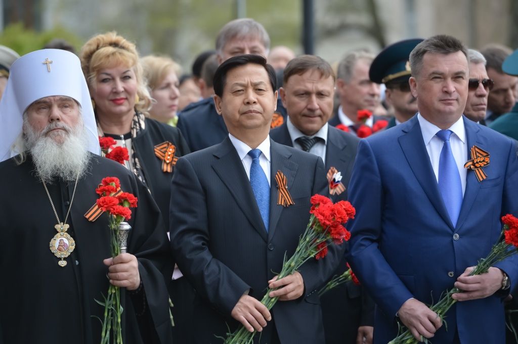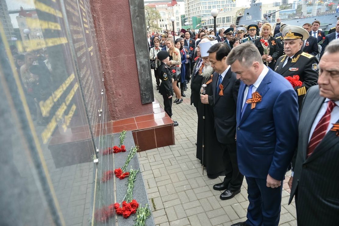 Митрополит Владивостокский и Приморский Вениамин вместе с ветеранами, чиновниками, военными, школьниками и воспитанниками патриотических организаций, представителями общественности, гостями из КНР возложили цветы у стелы «Владивосток - город воинской славы». почтил память павших в Великой Отечественной войне.