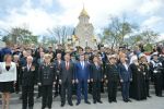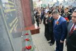 Под музыку духового оркестра участники церемонии возложили венки, гирлянды и букеты цветов к подножию мемориала.