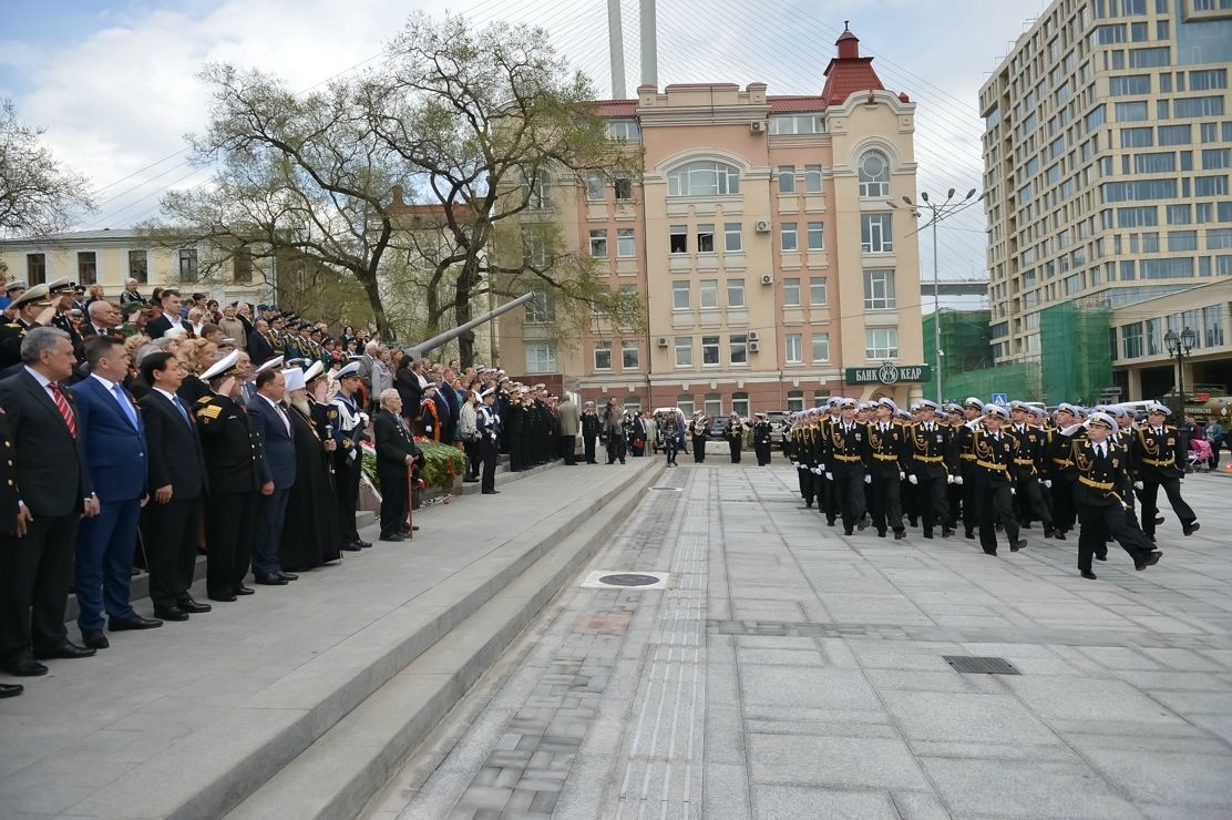 Затем участники церемонии отправились на Корабельную набережную, к мемориалу «Боевая слава ТОФ». Там юные воспитанники военно-патриотических училищ уже несли торжественную вахту у памятника адмиралу Кузнецову и у Вечного огня. На воспитанниках были красные ленты с названиями городов-героев: Смоленск, Новороссийск, Одесса…