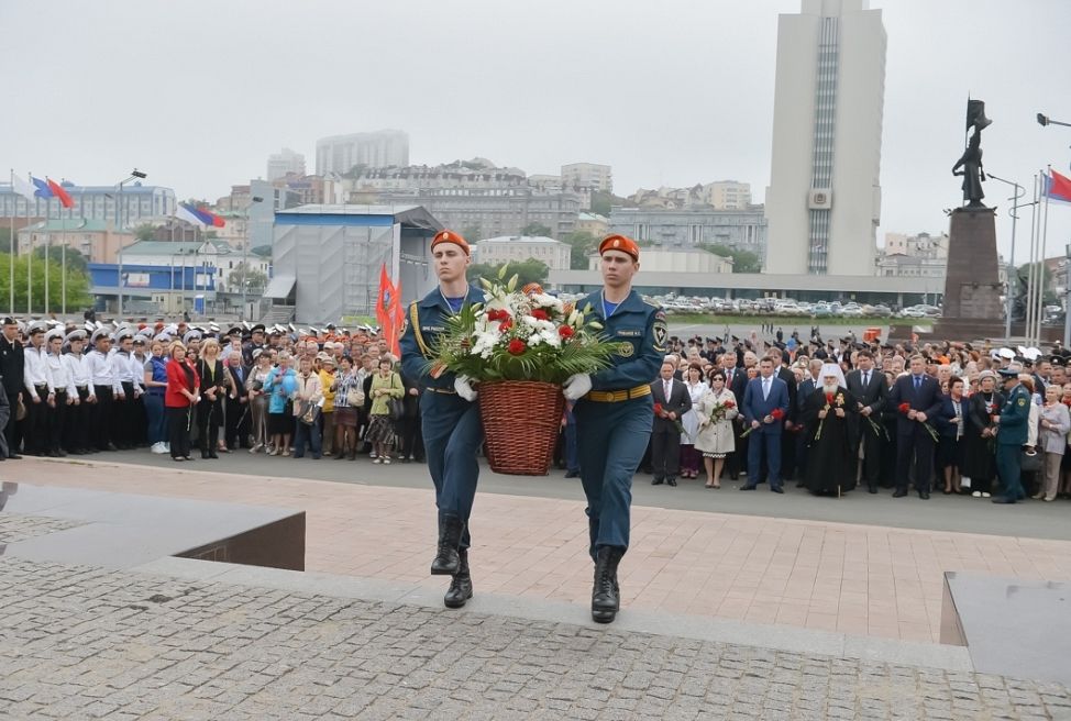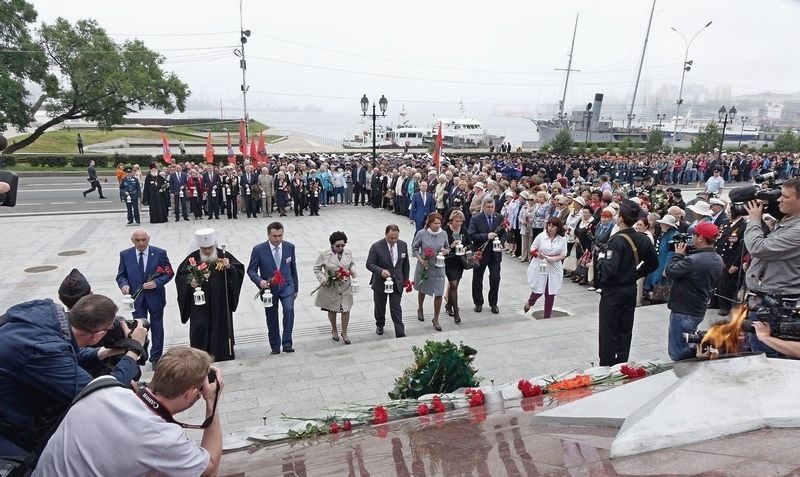 Владивосток - Находка. 74-ю годовщину начала Великой Отечественной войны отмечали по всей России. В Приморском крае 22 июня 2015 года прошел День памяти и скорби. Глава митрополии митрополит Владивостокский и Приморский Вениамин принял участие в церемонии возложения цветов к стеле «Владивосток – город воинской славы» и к Вечному огню на Корабельной набережной – вместе с губернатором Приморья Владимиром Миклушевским, главой Владивостока Игорем Пушкаревым, представителями Заксобрания, городской Думы, ветеранами.