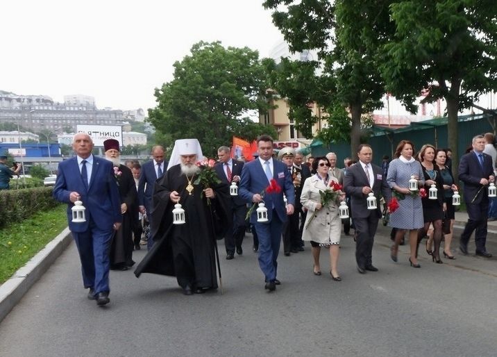 Память погибших почтили минутой молчания. Губернатор края В.Миклушевский и Глава Приморской митрополии владыка Вениамин обратились к собравшимся, отметив вклад приморцев в Великую Победу и важность чествования героев, на подвиге которых воспитываются молодые поколения. Затем более тысячи человек прошли в Колонне памяти, неся зажженные свечи.