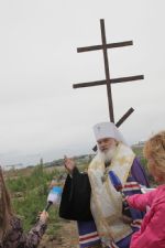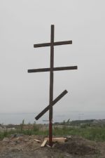 Пока же на этом месте установили Поклонный крест. 24 июня 2015 года сюда подогнали микрогрузовик с краном, с его помощью крест был поставлен; затем основание креста залили бетоном. Его Высокопреосвященство освятил землю и крест.