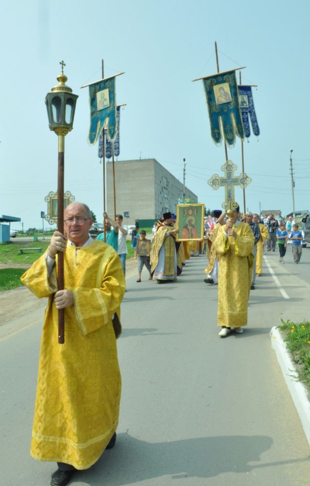 По окончании Литургии состоялся Крестный ход со славлением святого равноапостольного князя Владимира. Протоиерей Владимир Серебренников в своем пастырском слове отметил особую важность празднования 1000-летнего юбилея памяти Крестителя Руси и обратился к прихожанам с просьбой о помощи в восстановлении храма святого преподобного Серафима Саровского села Лазо. По традиции в завершении праздника состоялась трапеза.